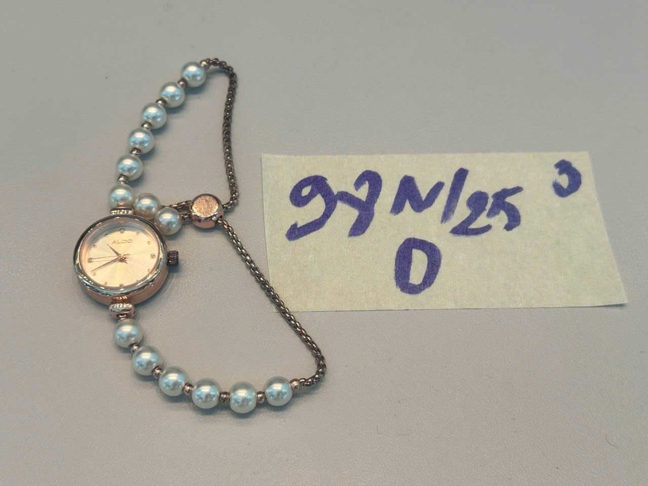 Ngày tiếp nhận: 22/11/2025 Mã hồ sơ: 98N2025D Mô tả: 01 đồng hồ mặt tròn, có chữ ALDO, dây màu trắng. |