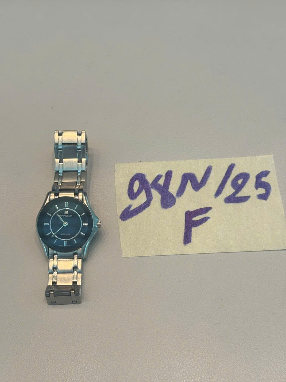 Ngày tiếp nhận: 22/11/2025 Mã hồ sơ: 98N2025F Mô tả: 01 đồng hồ kim loại mặt đen, dây trắng, có chữ HANDWA. |