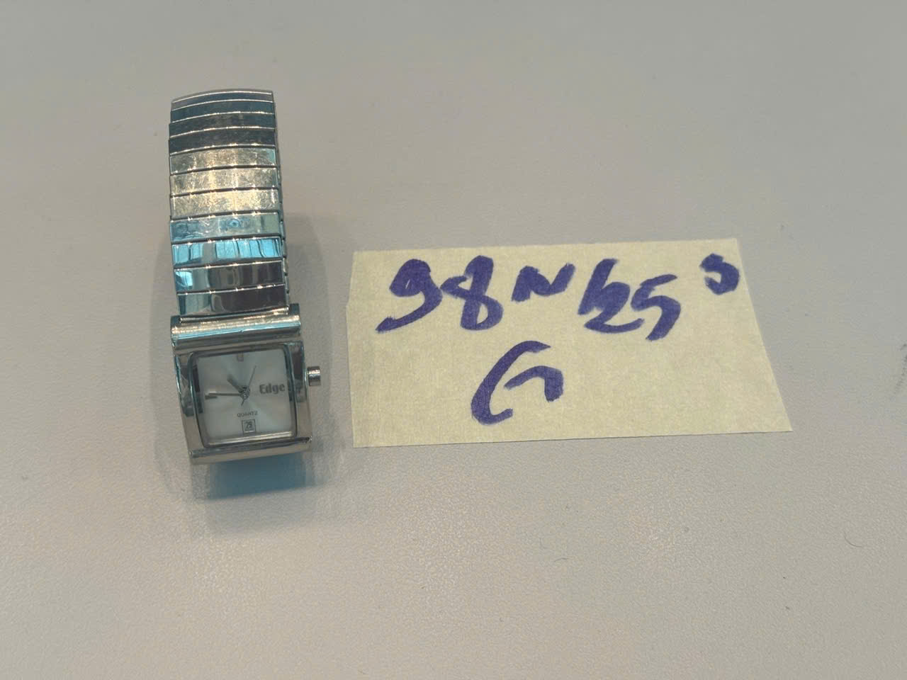 Ngày tiếp nhận: 22/11/2025 Mã hồ sơ: 98N2025G Mô tả: 01 đồng hồ kim loại mặt trắng, dây trắng, có chữ EDGE. |