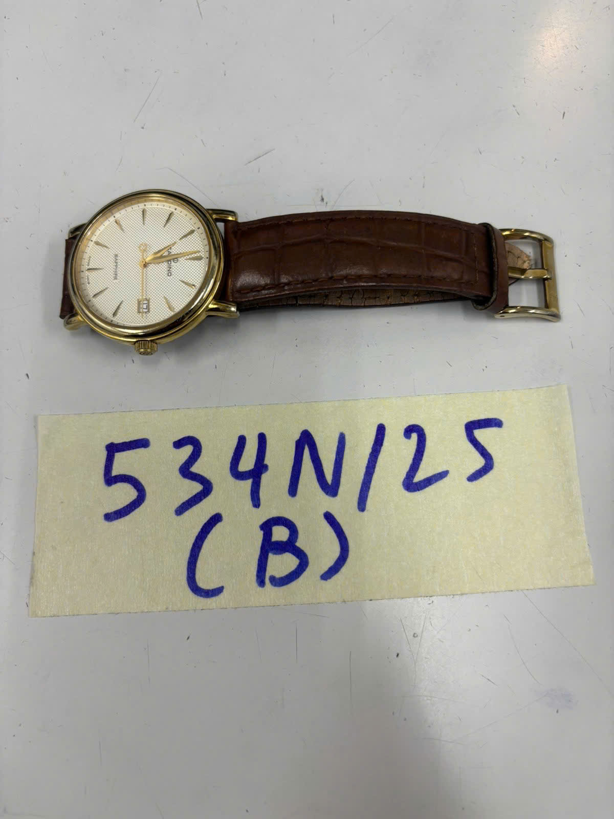 Ngày tiếp nhận: 22/03/2025 Mã hồ sơ: 534N2025B Mô tả: 01 đồng hồ kim loại màu vàng chữ CADINO. |