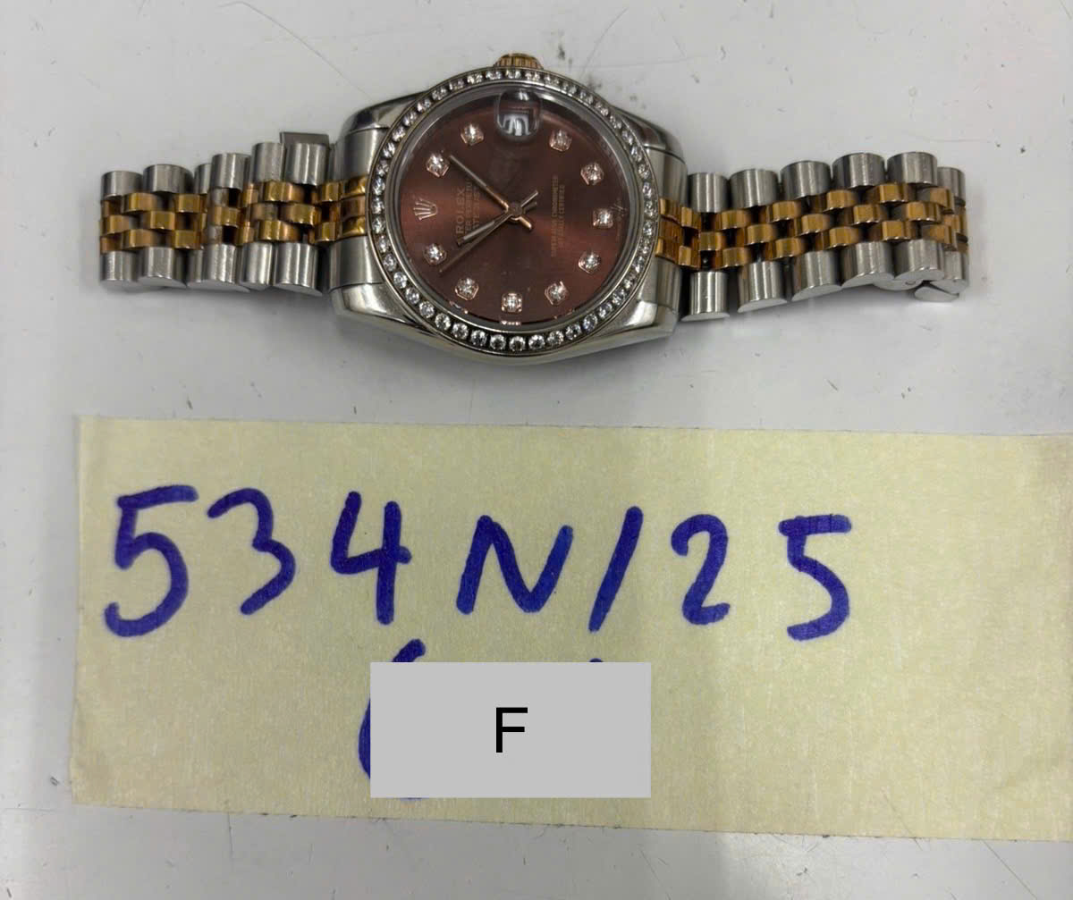 Ngày tiếp nhận: 22/03/2025 Mã hồ sơ: 534N2025F Mô tả: 01 đồng hồ kim loại màu bạc-nâu có chữ ROLEX. |