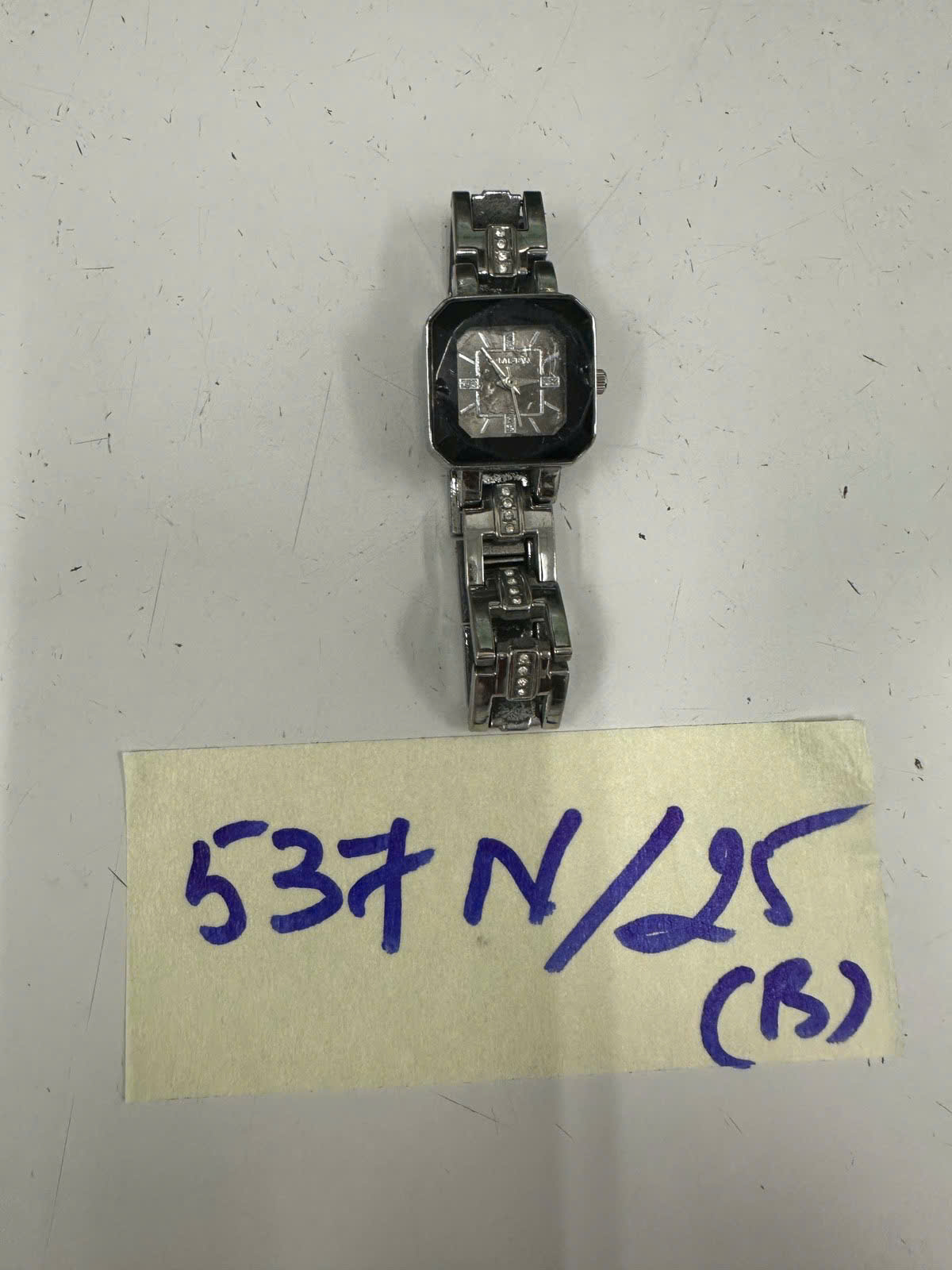 Ngày tiếp nhận: 23/03/2025 Mã hồ sơ: 537N2025B Mô tả: 01 đồng hồ dây kim loại màu trắng, mặt màu đen chữ TIME100. |
