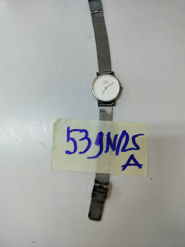 Ngày tiếp nhận: 24/03/2025 Mã hồ sơ: 539N2025A Mô tả: 01 đồng hồ mặt hình tròn màu trắng có chữ Daniel Wellington, dây đeo kim loại màu. |