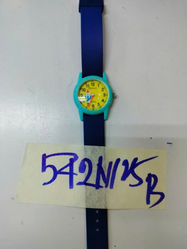 Ngày tiếp nhận: 24/03/2025 Mã hồ sơ: 542N2025B Mô tả: 01 đông hồ nhựa mặt tròn, dây da xanh dương, mặt sau có chữ "MINGRU!". |