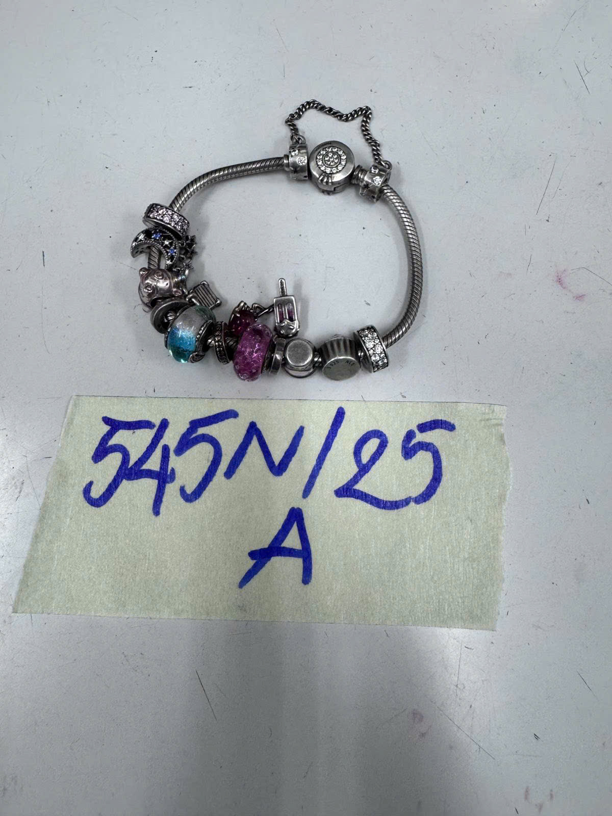 Ngày tiếp nhận: 24/03/2025 Mã hồ sơ: 545N2025A Mô tả: 01 vòng tay kim loại màu bạc có nhiều charm. |