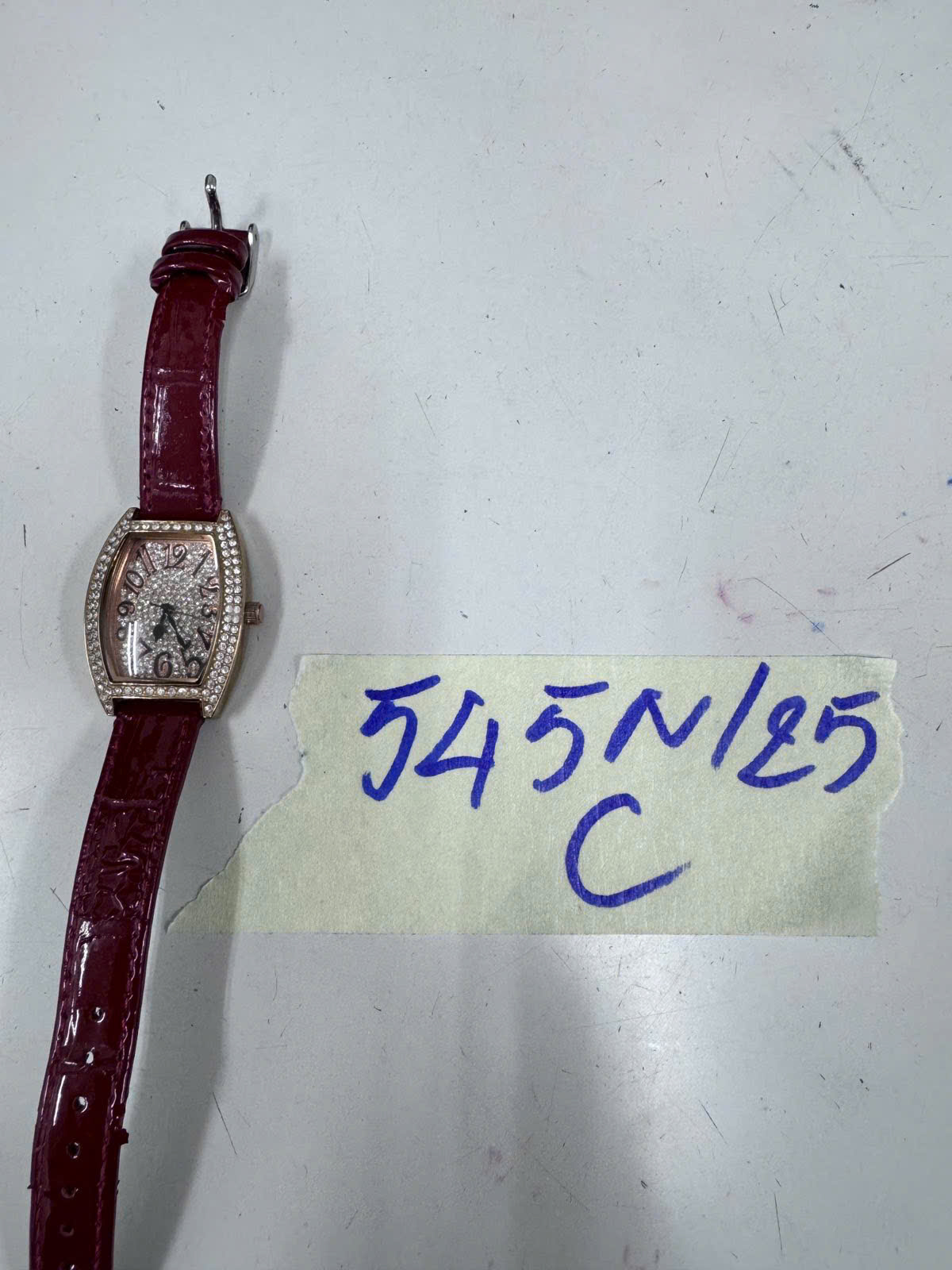 Ngày tiếp nhận: 24/03/2025 Mã hồ sơ: 545N2025C Mô tả: 01 đồng hồ hình chữ nhật có đính đá viền màu trắng dây đỏ, mặt sau có chữ “MOBANGTUO". |