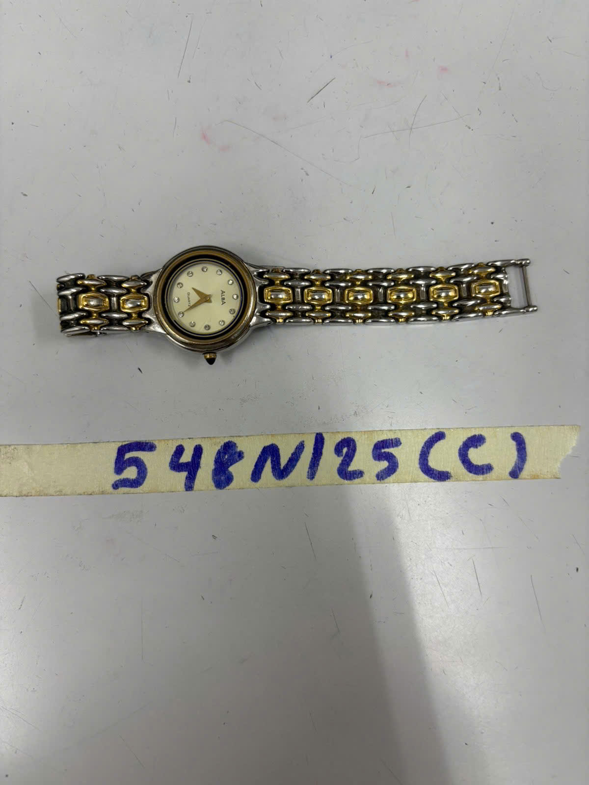 Ngày tiếp nhận: 25/03/2025 Mã hồ sơ: 548N2025C Mô tả: 01 đồng hồ đeo tay dây kim loại màu trắng, vàng, có chữ "ALBA". |