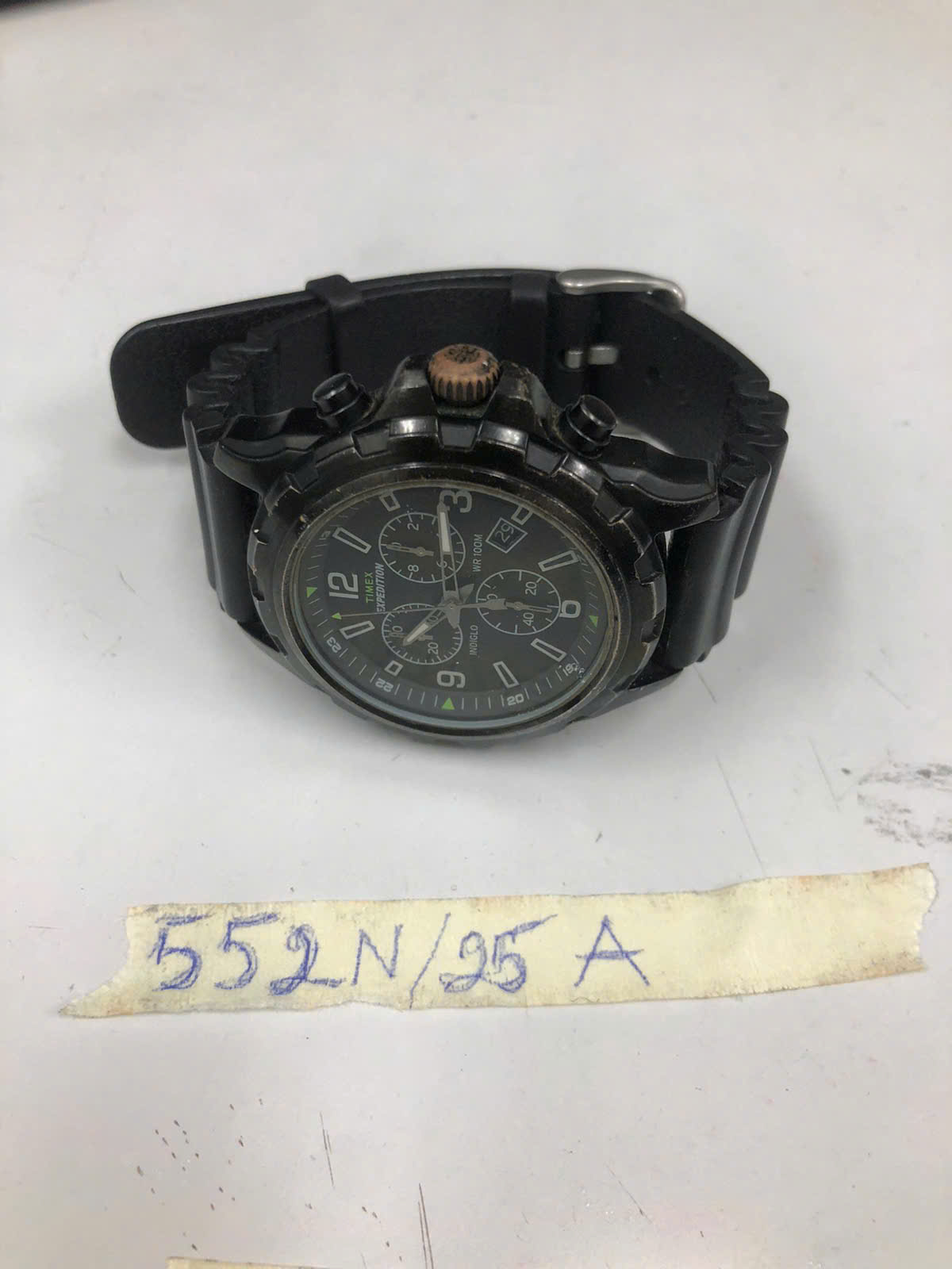 Ngày tiếp nhận: 26/03/2025 Mã hồ sơ: 552N2025A Mô tả: 01 đồng hồ kim loại, mặt đồng hồ hình tròn màu đen có chữ "TIME X EXPEDITION", dây nhựa màu đen. |