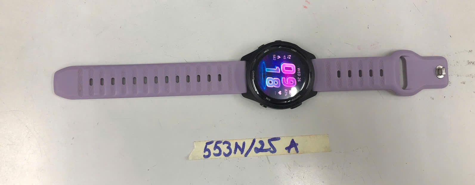 Ngày tiếp nhận: 26/03/2025 Mã hồ sơ: 553N2025A Mô tả: 01 đồng hồ đeo tay điện tử mặt tròn màu đen có chữ GARMIN, dây đeo bằng silicon màu hồng. |