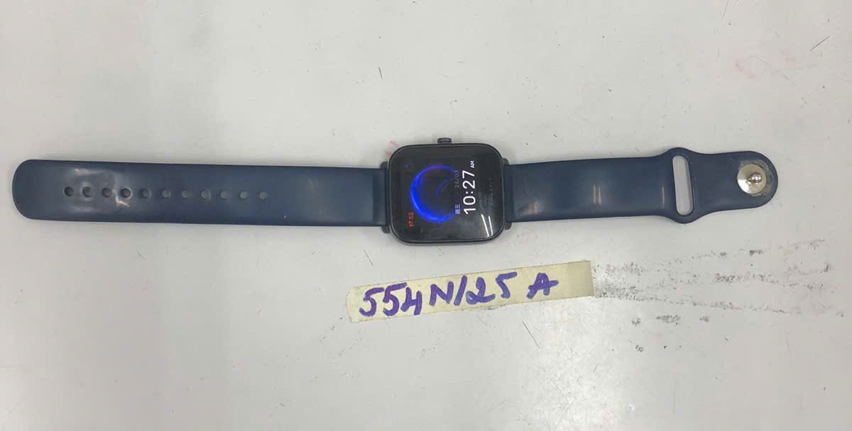 Ngày tiếp nhận: 26/03/2025 Mã hồ sơ: 554N2025A Mô tả: 01 đồng hồ thông minh, mặt đồng hồ hình chữ nhật màu đen có chữ "AMAZ FIT", dây cao su màu xanh. |