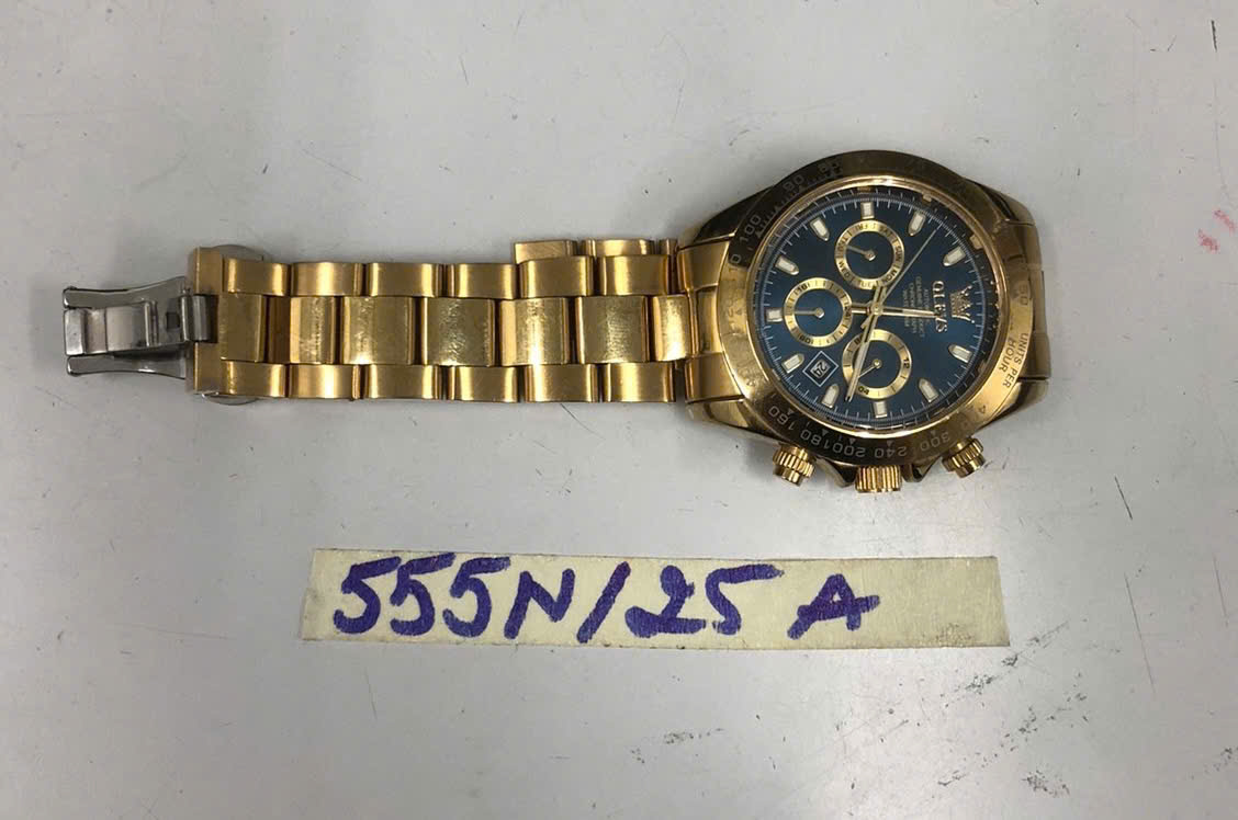Ngày tiếp nhận: 26/03/2025 Mã hồ sơ: 555N2025A Mô tả: 01 đồng hồ kim loại, mặt đồng hồ hình tròn màu xanh có chữ "OLEVS", dây kim loại màu vàng. |