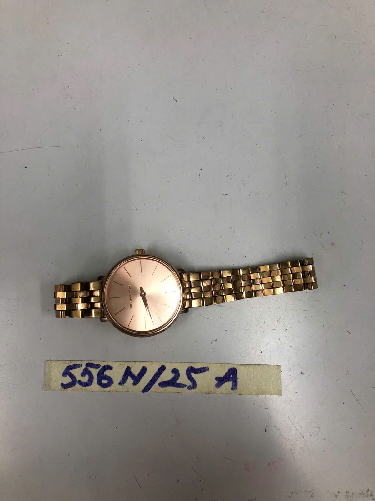 Ngày tiếp nhận: 26/03/2025 Mã hồ sơ: 556N2025A Mô tả: 01 đồng hồ, mặt đồng hồ hình tròn màu vàng có chữ "MICHAEL KORS", dây kim loại màu vàng. |