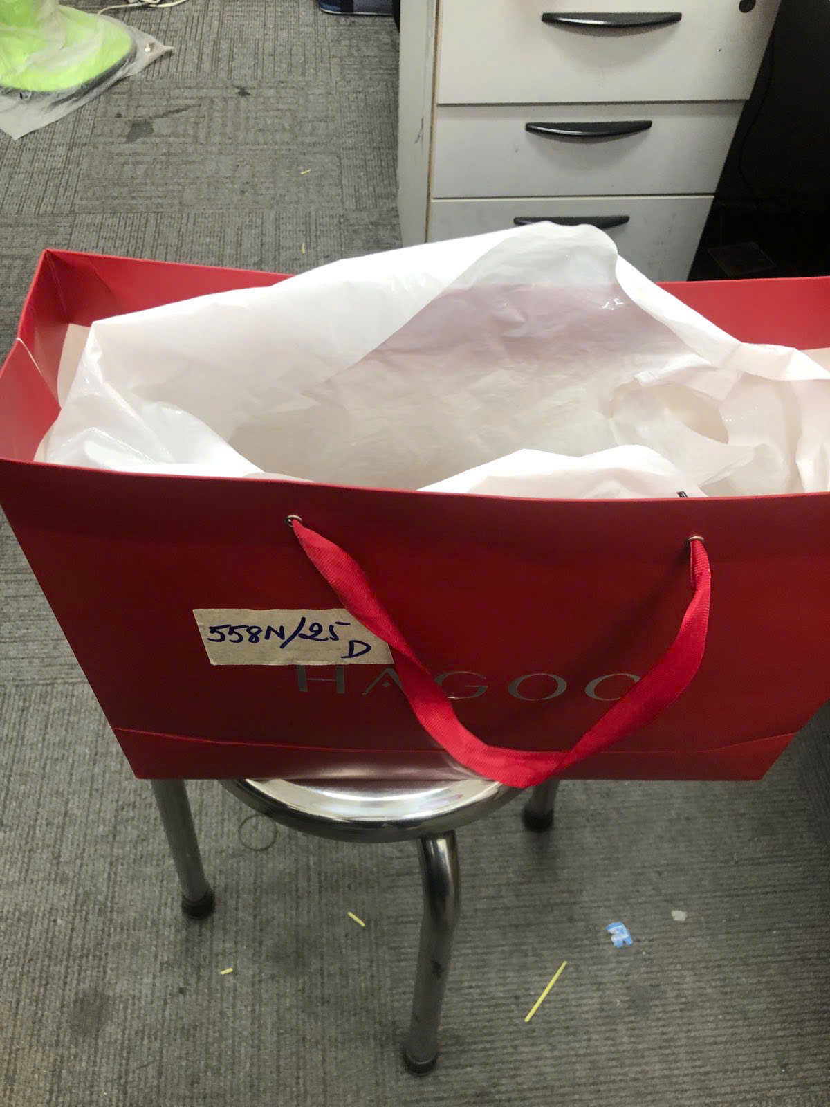 Ngày tiếp nhận: 26/03/2025 Mã hồ sơ: 558N2025D Mô tả: 01 đôi guốc màu đen có chữ " Christian..." dựng trong túi giấy màu đỏ có chữ “HAGOO". |