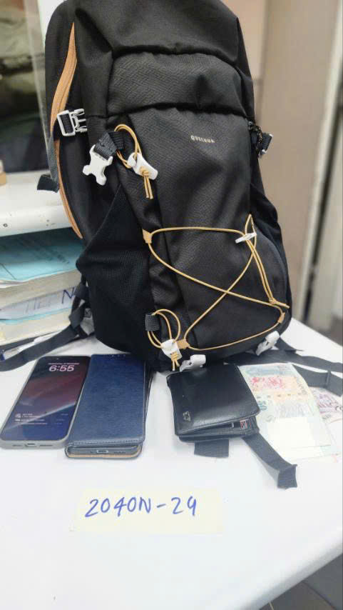 Ngày tiếp nhận: 27/11/2024 Mã hồ sơ: 2040N2024 Mô tả: 01 balo vải màu đen: 01 điện thoại OPPO màu xanh, 01 điện thoại Iphone màu xám, nhiều thẻ nhựa cùng tên CHEW PANG WUE, 164 đô Singapore. |