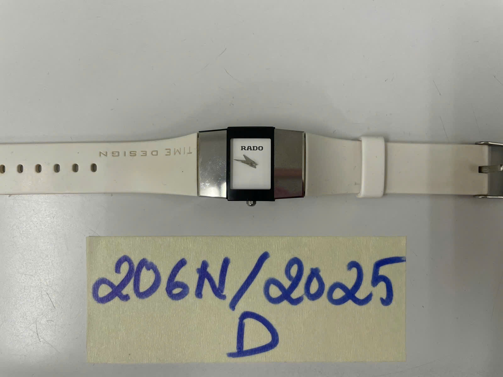 Ngày tiếp nhận: 28/01/2025 Mã hồ sơ: 206N2025D Mô tả: 01 đồng hồ RADO mặt màu trắng, viền màu bạc, dây cao su màu trắng. |