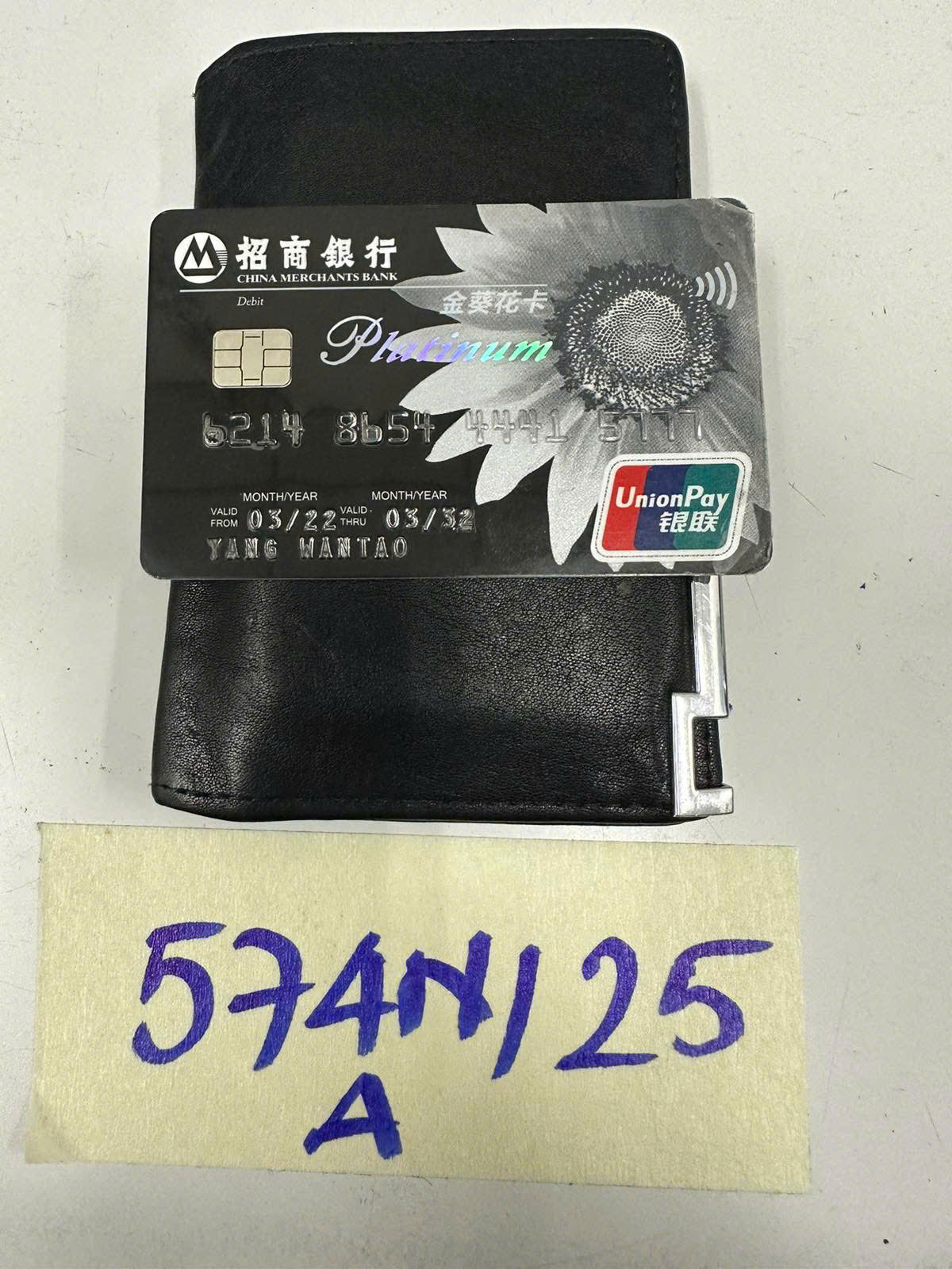 Ngày tiếp nhận: 29/03/2025 Mã hồ sơ: 574N2025A Mô tả: 01 ví thẻ màu đen có 04 thẻ NH tên Yang Wantao. |