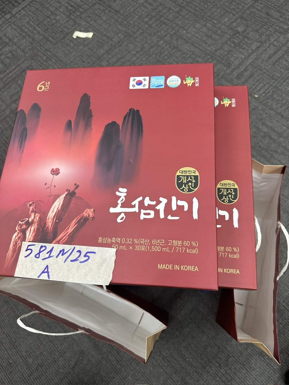 Ngày tiếp nhận: 31/03/2025 Mã hồ sơ: 581N2025A Mô tả: 02 túi giấy màu đỏ trên hộp chữ MADE in KOREA (thực phẩm chức năng qua sử dụng). |