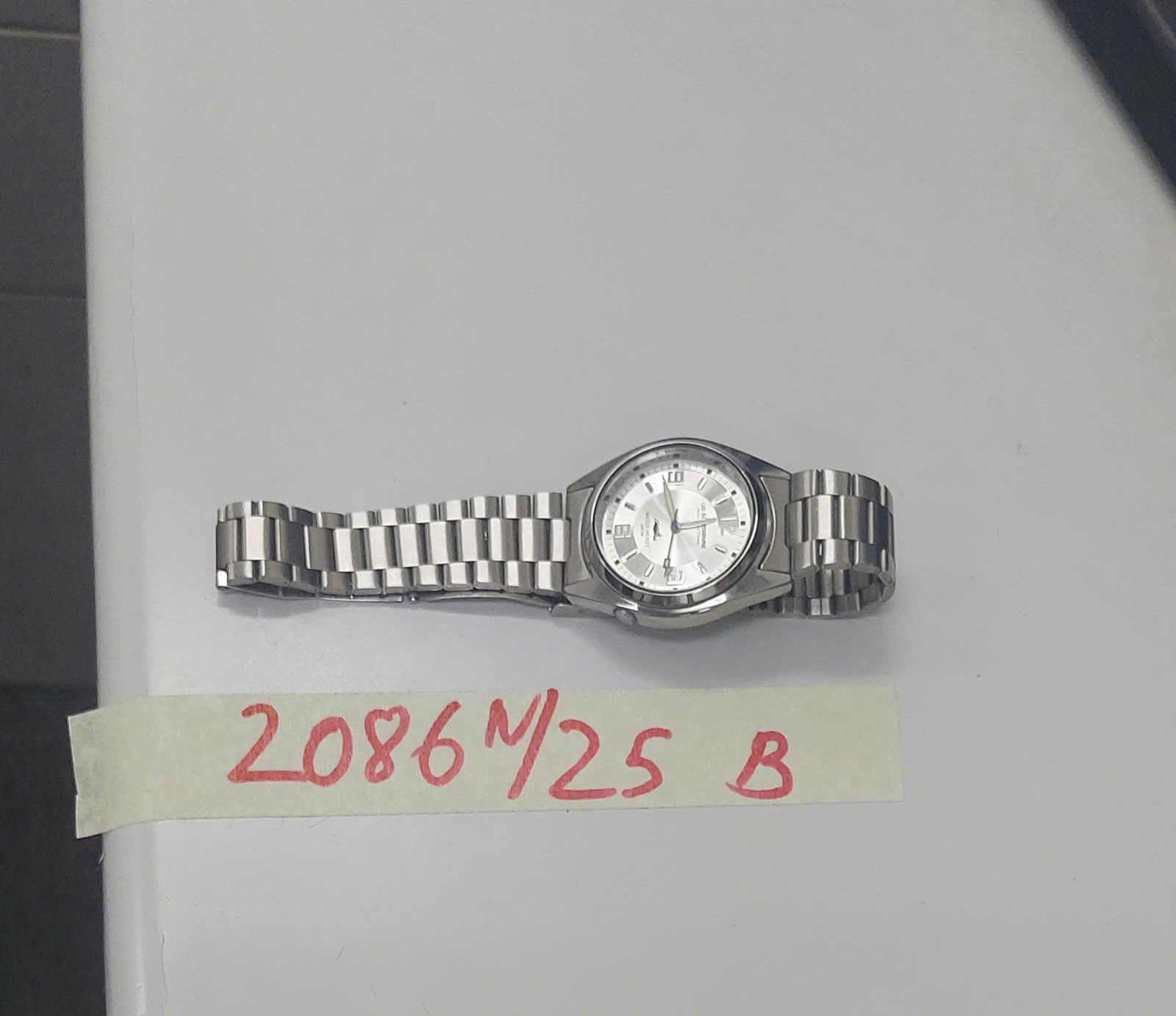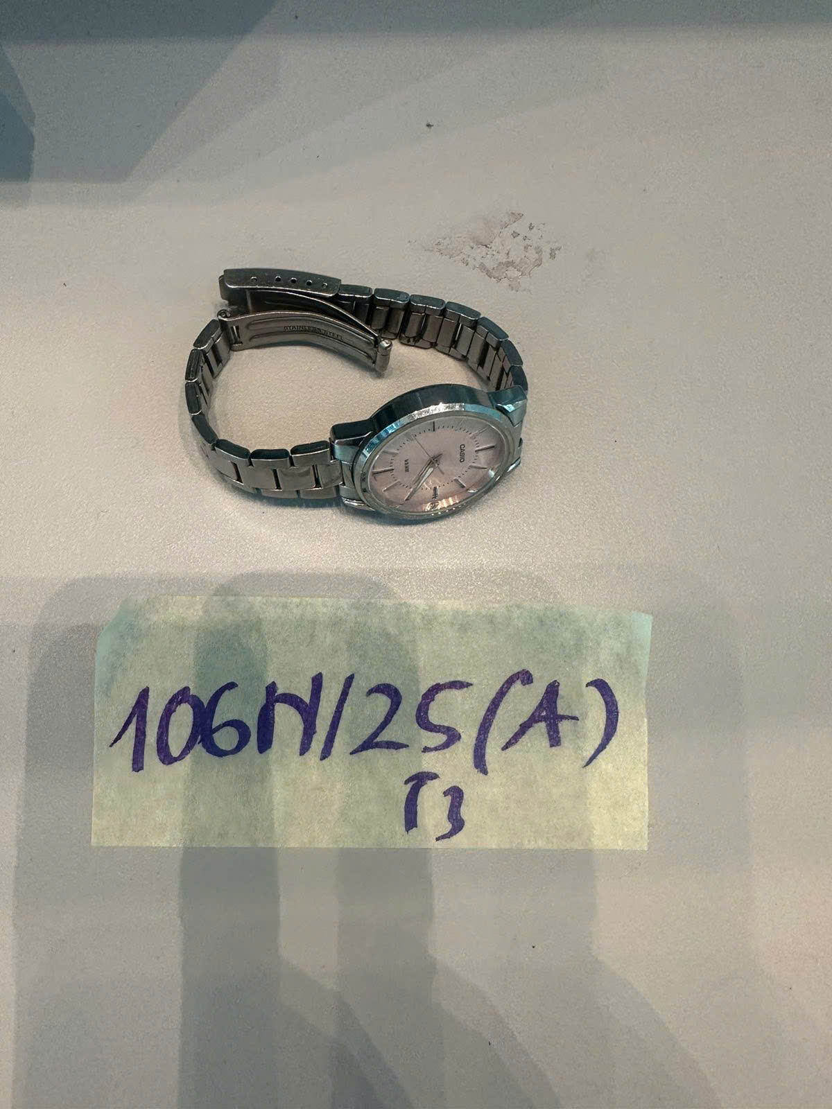 Ngày tiếp nhận: 29/11/2025 Mã hồ sơ: 106N2025A Mô tả: 01 đồng hồ kim loại màu trắng có chữ "CASIO". |