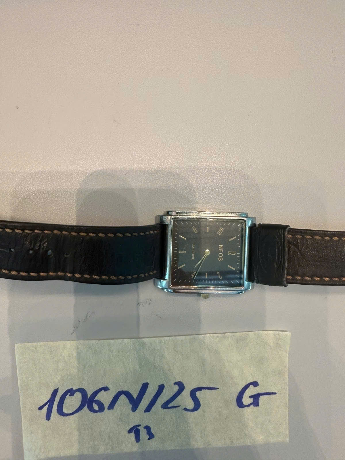 Ngày tiếp nhận: 29/11/2025 Mã hồ sơ: 106N2025G Mô tả: 01 đồng hồ dây da màu nâu có chữ "NEOS". |