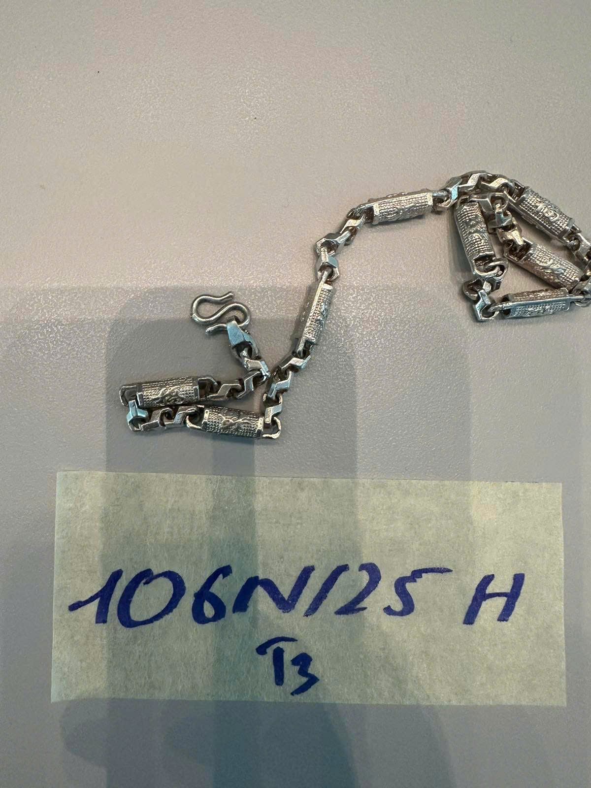 Ngày tiếp nhận: 29/11/2025 Mã hồ sơ: 106N2025H Mô tả: 01 dây chuyền kim loại màu bạc. |