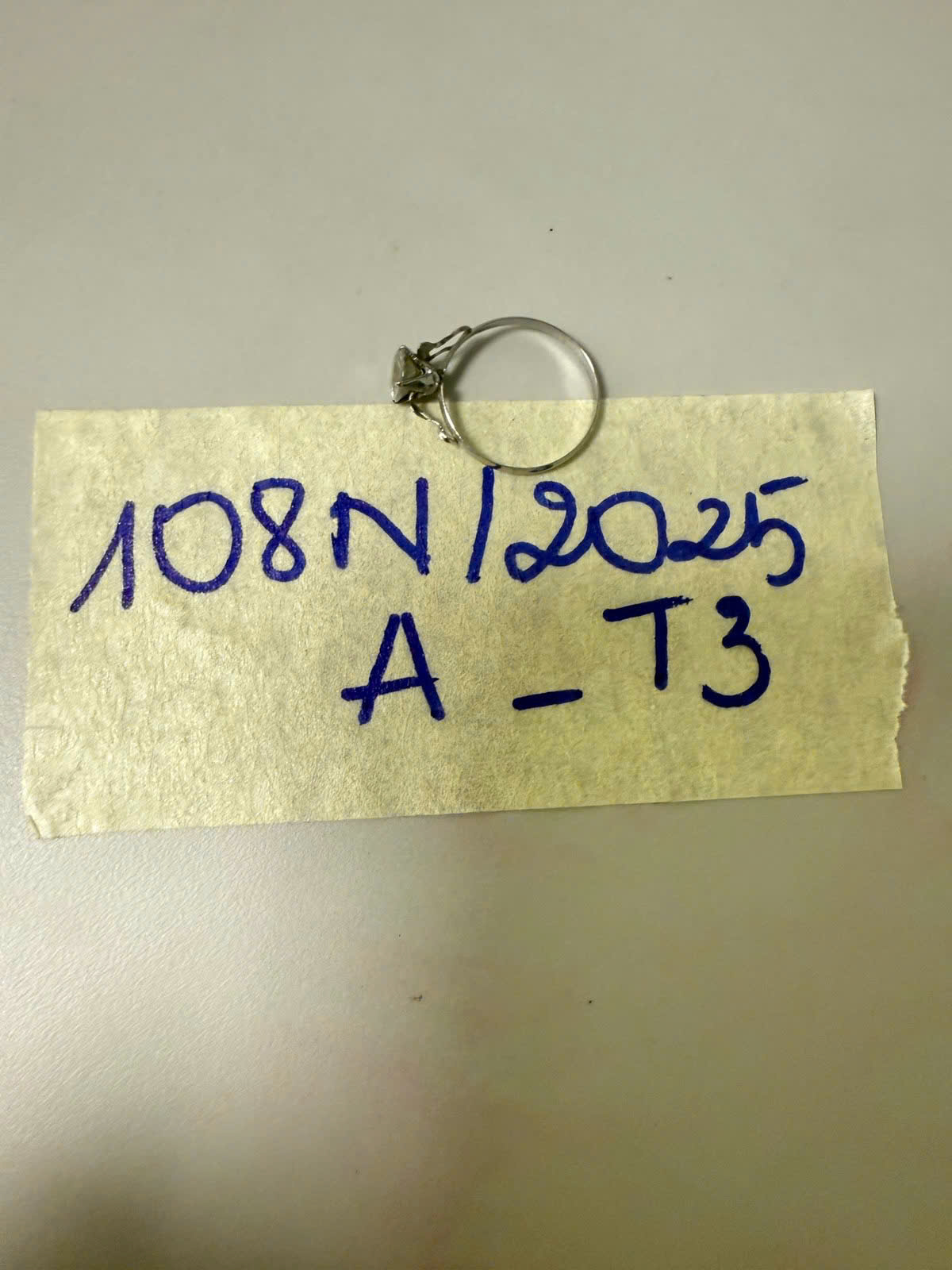 Ngày tiếp nhận: 29/11/2025 Mã hồ sơ: 108N2025A Mô tả: 01 nhẫn kim loại màu trắng có đính đá. |