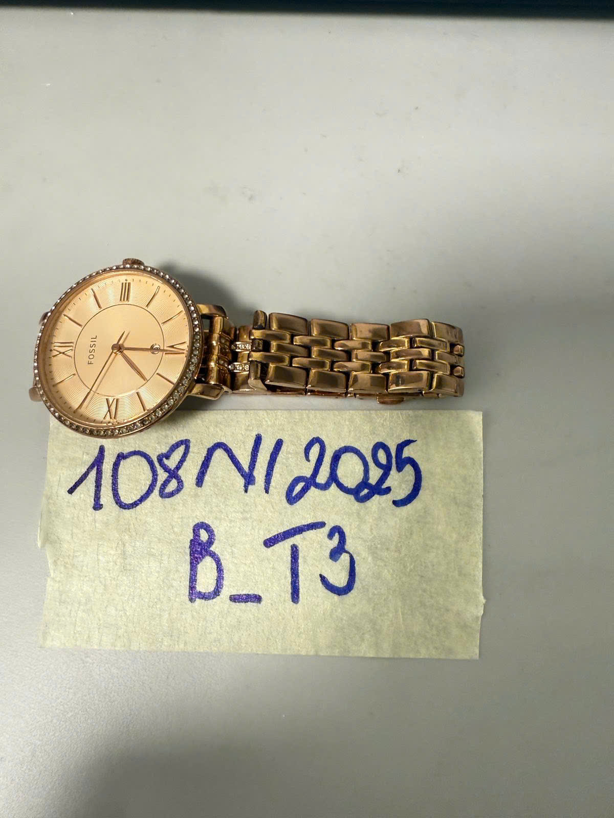 Ngày tiếp nhận: 29/11/2025 Mã hồ sơ: 108N2025B Mô tả: 01 đồng hồ kim loại mặt tròn, dây kim loại màu vàng có ghi chữ "Fossil". |