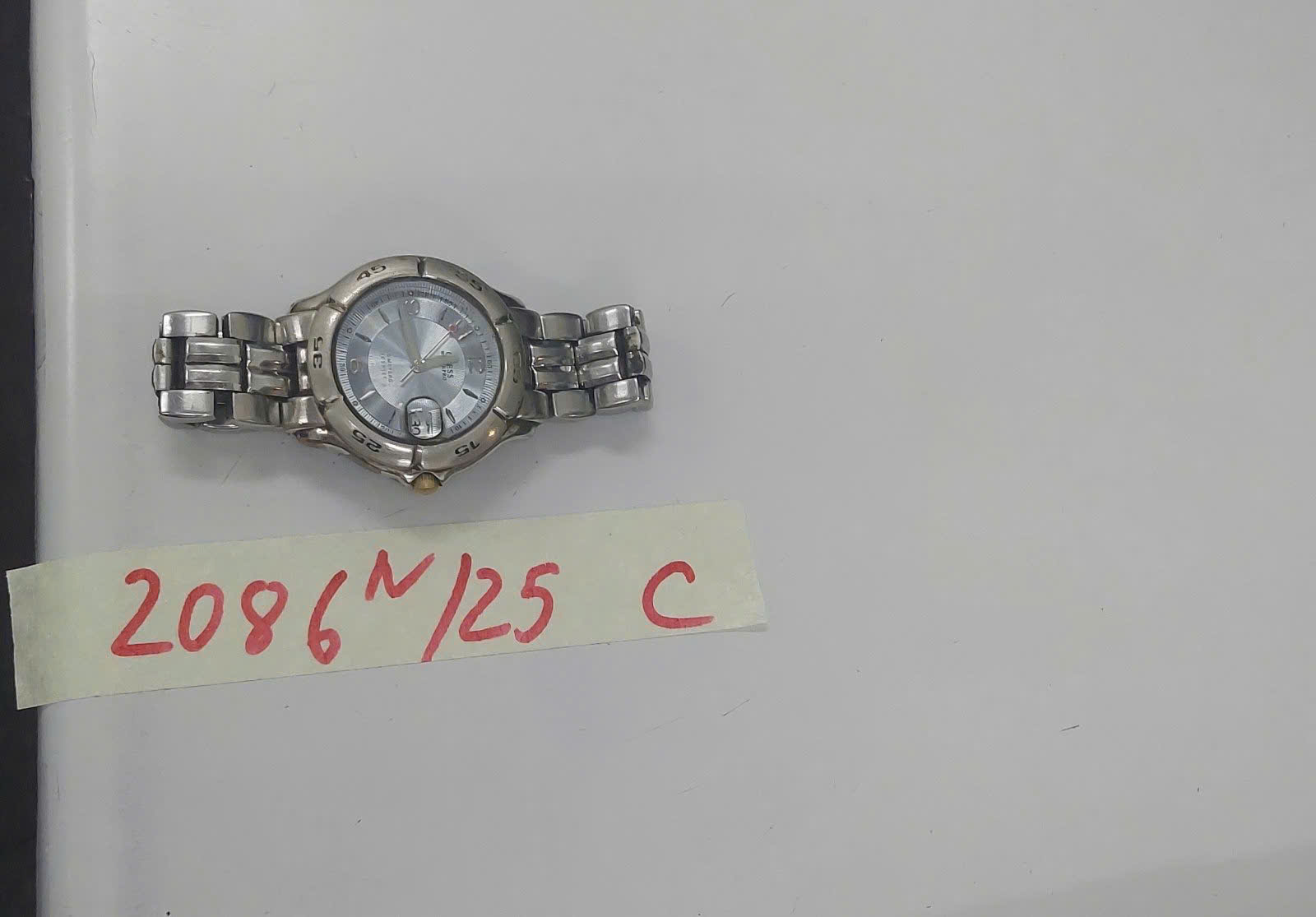 Ngày tiếp nhận: 30/11/2025 Mã hồ sơ: 2086N2025C Mô tả: 01 Đồng hồ kim loại màu bạc mặt tròn có chữ "GUESS" kèm dây đeo màu bạc bằng kim. |