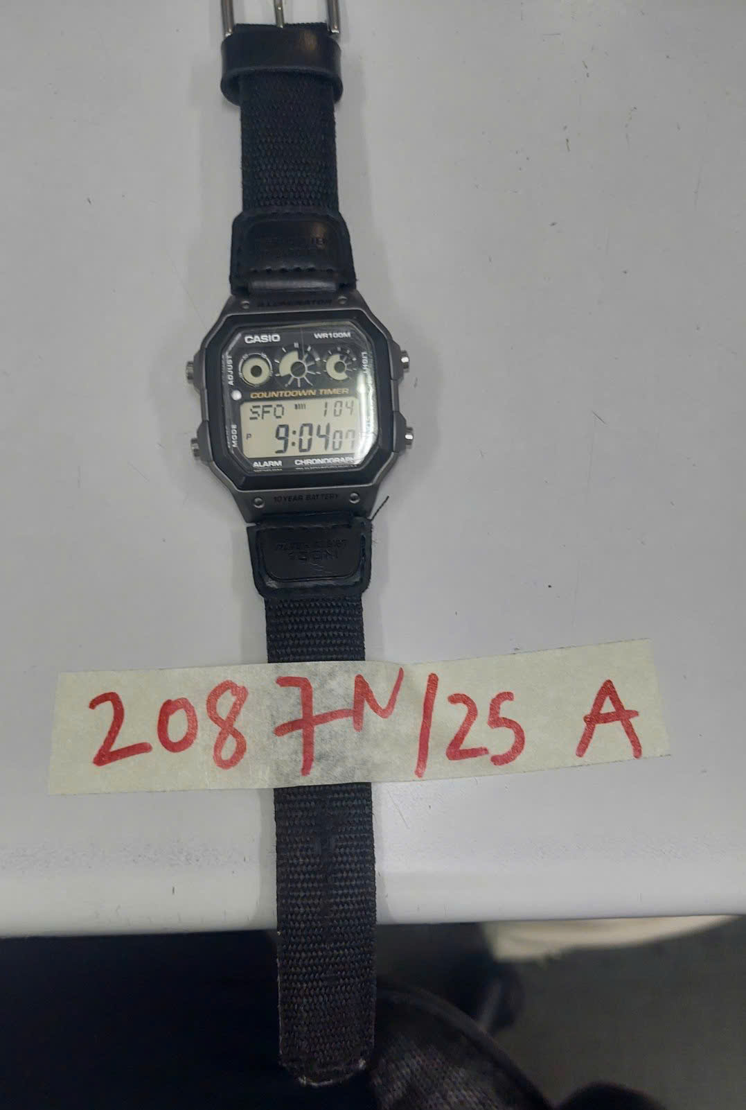 Ngày tiếp nhận: 30/11/2025 Mã hồ sơ: 2087N2025A Mô tả: 01 đồng hồ bằng nhựa màu đen mang nhữa hiệu "CASIO" mặt sau có dãy số "3426" kèm dây đeo vải màu đen. |