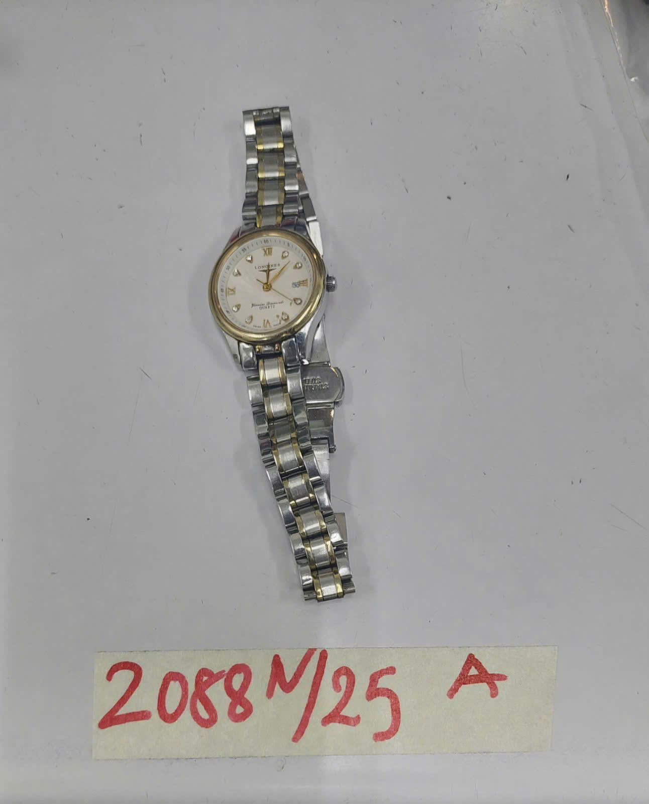 Ngày tiếp nhận: 30/11/2025 Mã hồ sơ: 2088N2025A Mô tả: 01 đồng hồ bằng kim loại mặt hình tròn màu trắng viền màu vàng chữ LONGINES, đây đeo bằng kim loại màu trắng. |