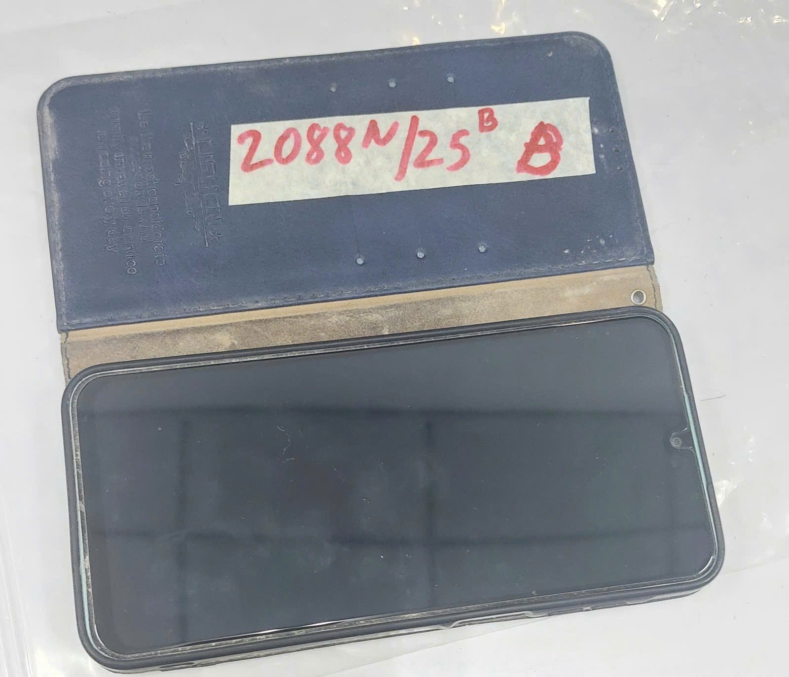 Ngày tiếp nhận: 30/11/2025 Mã hồ sơ: 2088N2025B Mô tả: 01 điện thoại màu xanh SAMSUNG, ấp lưng bằng da màu xanh LISHEN. |