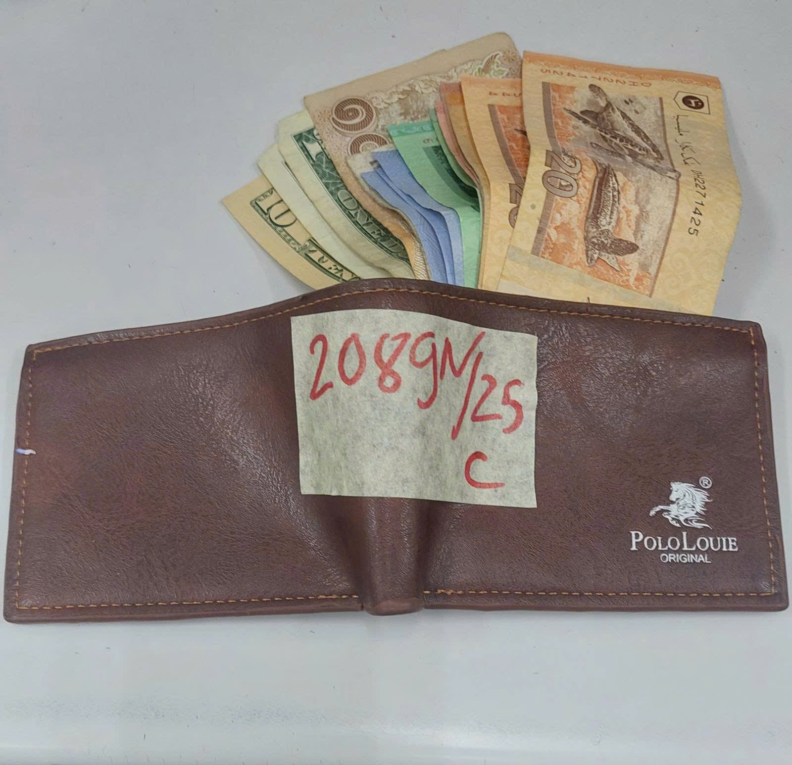 Ngày tiếp nhận: 30/11/2025 Mã hồ sơ: 2089N2025C Mô tả: 01 ví tiền bằng da màu nâu có chữ POLOLOUIE, bên trong có một số tiền mặt: + 12 USD (mười hai đo la Mỹ), 1000 BATH (một nghỉn BATH Thái lan), 93 RINGGIT (chín mươi ba RINGGIT Malaysia), 1000 VNĐ (một nghìn đồng Việt Nam) ngoài ra không còn gì có giá trị. |