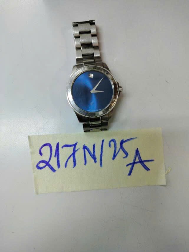 Ngày tiếp nhận: 30/01/2025 Mã hồ sơ: 217N2025A Mô tả: 01 đồng hồ đeo tay bằng kim loại mặt tròn màu trắng, mặt màu xanh dương có chữ SWISS MOVADO MADE, dây đeo bằng kim loại màu trắng. |