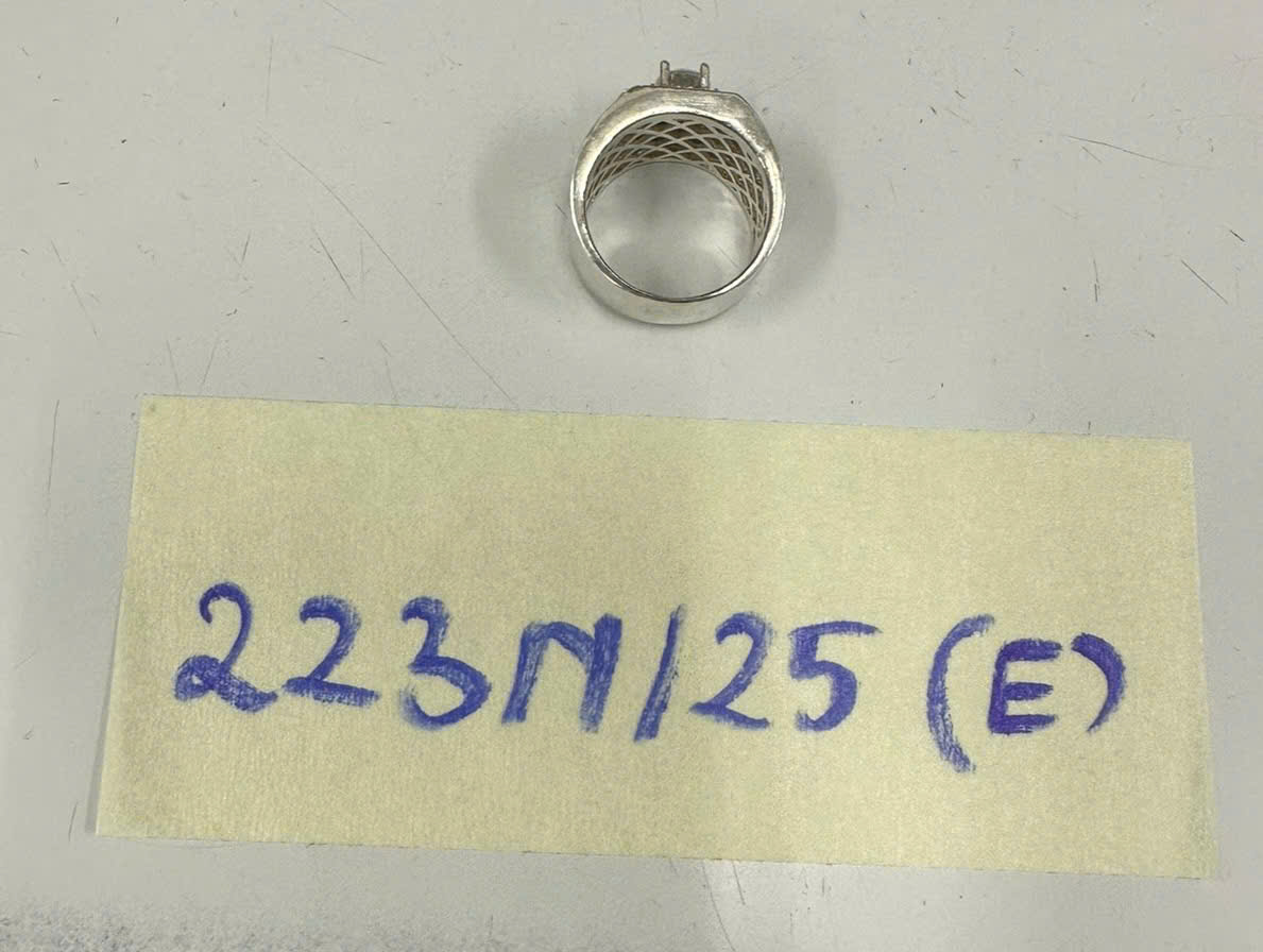 Ngày tiếp nhận: 30/01/2025 Mã hồ sơ: 223N2025E Mô tả: 01 nhẫn kim loại màu trắng bên trên có đính đá màu trắng. |