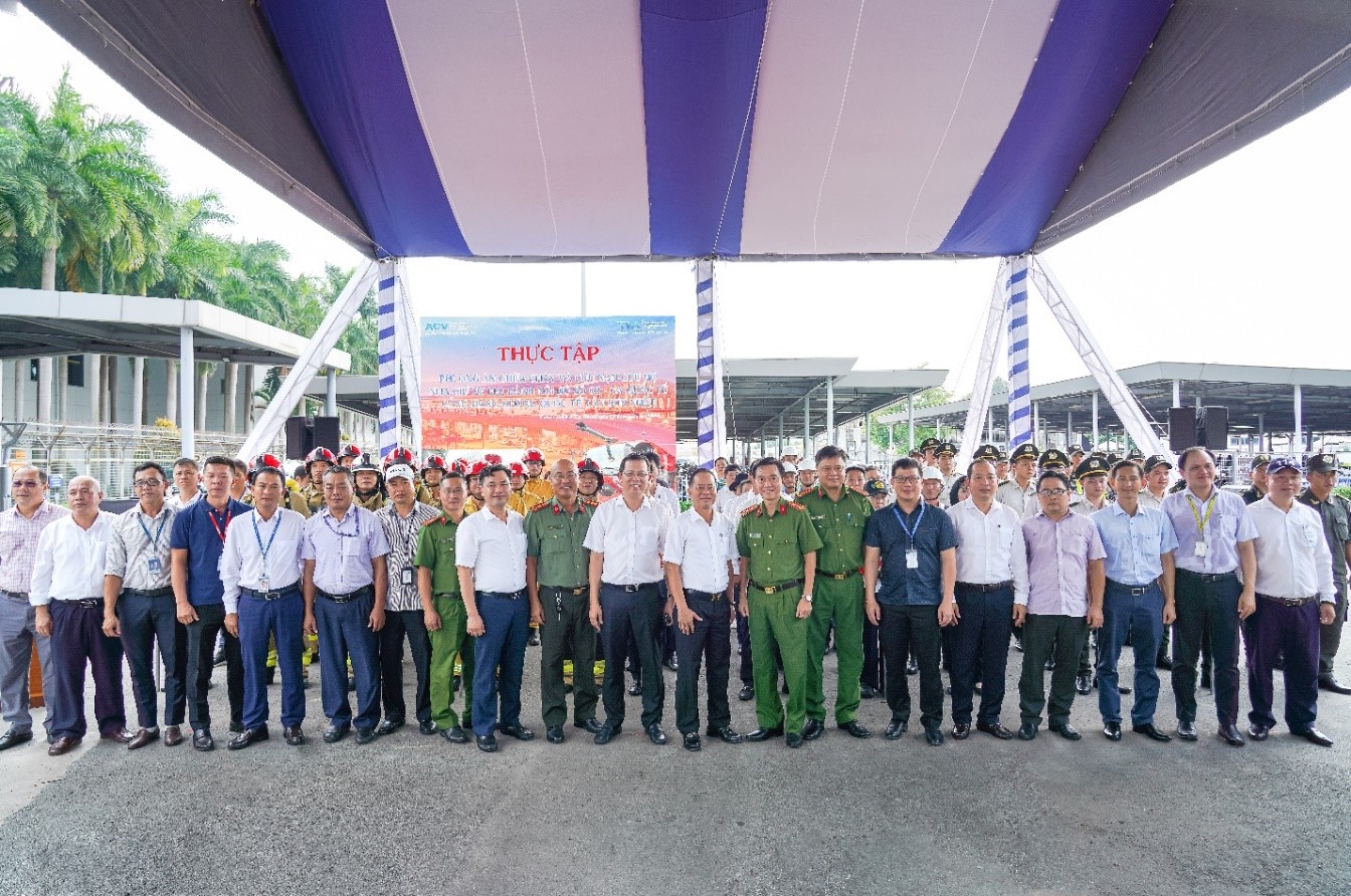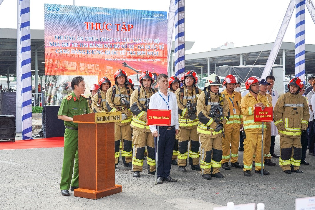 Cảng HKQT Tân Sơn Nhất với sự tham dự của đồng chí Đặng Ngọc Cương, Bí thư Đảng ủy, Giám đốc Cảng HKQT Tân Sơn Nhất; đồng chí Nguyễn Công Hoàn, UV. BTV Đảng ủy, Phó Giám đốc Cảng, Trưởng Ban Chỉ đạo diễn tập năm 2024; đồng chí Nguyễn Toàn Đắc, Phó Giám đốc Cảng; đại diện thủ trưởng các phòng chức năng, trung tâm trực thuộc Cảng cùng các lực lượng tham gia diễn tập PCCC năm 2024.