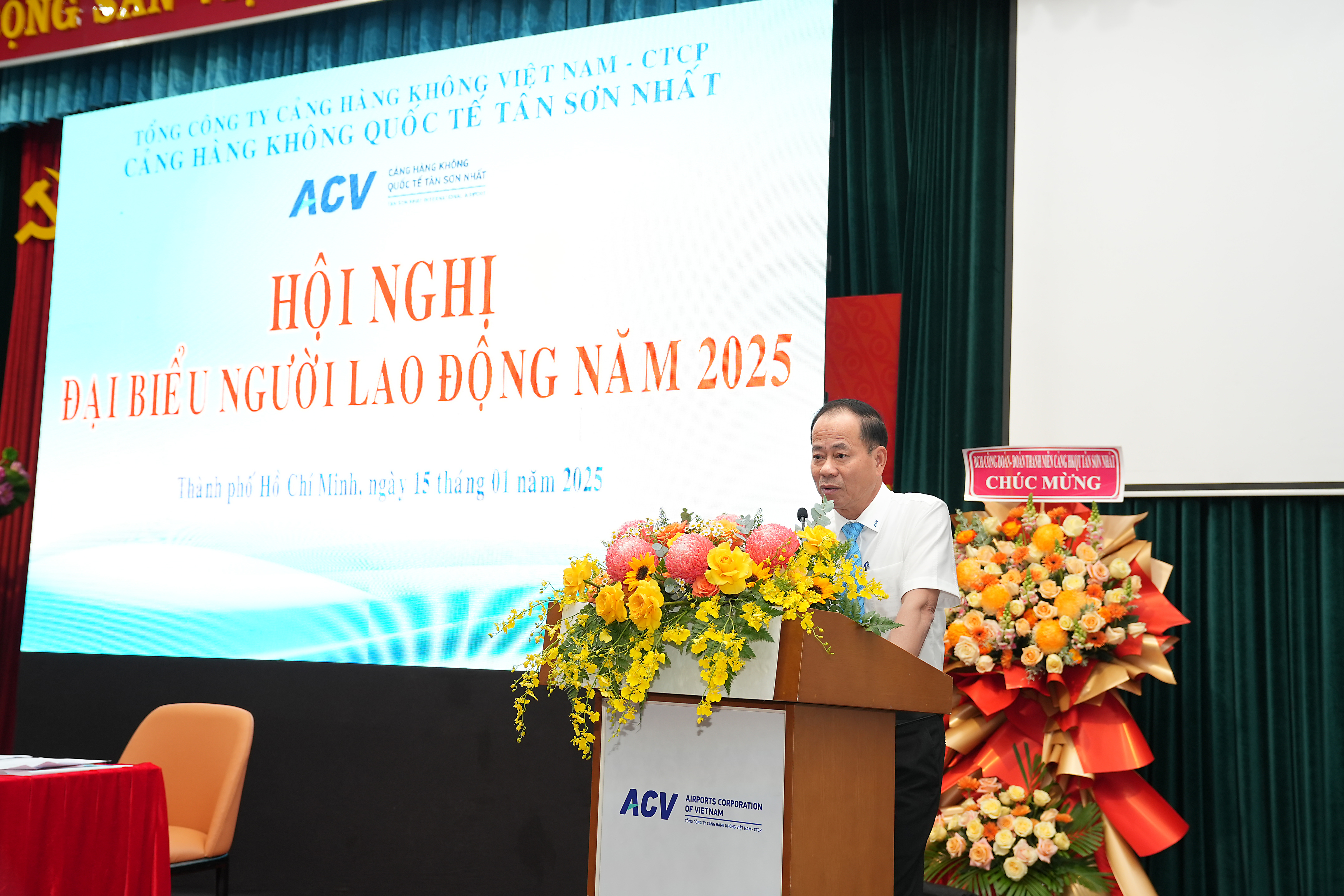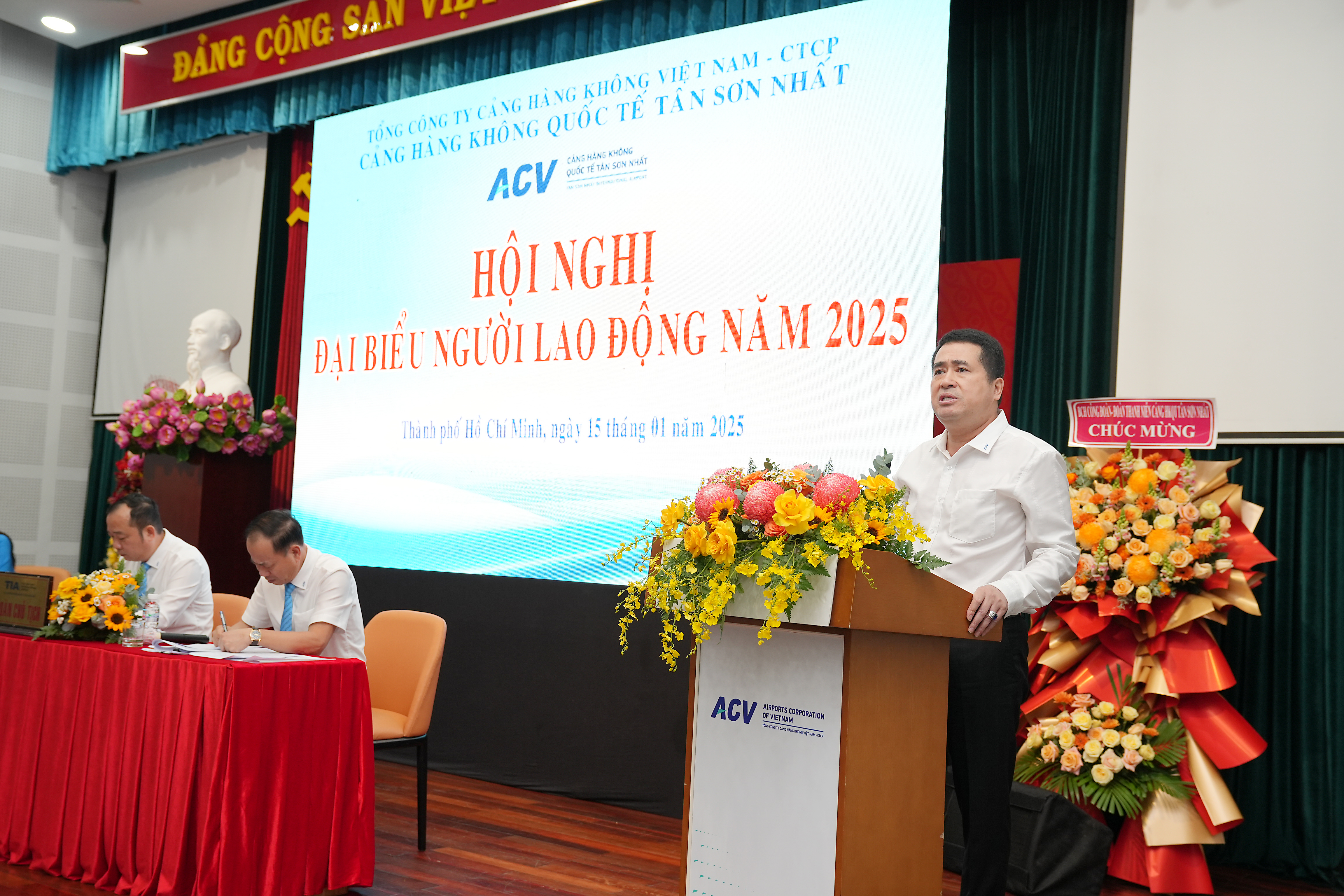 Phát biểu chỉ đạo tại Hội nghị, đồng chí Lê Khả Trường, Ủy viên Ban Thường vụ Đảng ủy, Chủ tịch Công đoàn Tổng công ty Cảng HKVN đã ghi nhận những kết quả trong năm 2024 của Cảng HKQT Tân Sơn Nhất. Đảng ủy ACV đánh giá cao sự đoàn kết, thống nhất, nỗ lực vượt khó của tập thể Ban lãnh đạo Cảng và CBNV-NLĐ trong thời gian vừa qua. Cảng đã bảo đảm tốt an ninh an toàn hàng không, nâng cao chất lượng dịch vụ, duy trì tốt các chỉ tiêu tài chính, tổ chức điều hành khai thác hiệu quả, góp phần tăng doanh thu (hàng không và phi hàng không) cho Tổng công ty. Thời gian tới, Cảng HKQT Tân Sơn Nhất sẽ đưa vào khai thác nhà ga hành khách T3, đây là công trình trọng điểm mà tập thể Ban lãnh đạo Cảng cần tập trung lãnh đạo, chỉ đạo hiệu quả. Về việc thực hiện Nghị quyết số 18-NQ/TW của Ban Chấp hành Trung ương về sắp xếp tinh gọn bộ máy, Tổng công ty nghiêm túc triển khai đảm bảo “tinh – gọn – mạnh – hiệu lực – hiệu quả” với tinh thần “không bỏ CBNV-NLĐ nào ở lại phía sau”.