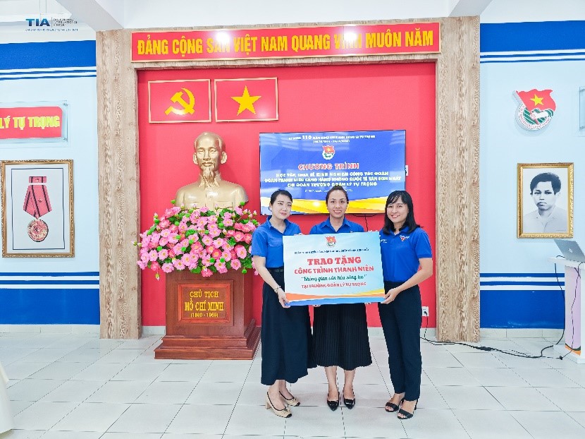 Đồng chí Nguyễn Thị Thanh Thúy, Bí thư Chi đoàn Trường đoàn Lý Tự Trọng (ở giữa) đón nhận Công trình thanh niên do Đoàn Cảng HKQT trao tặng.