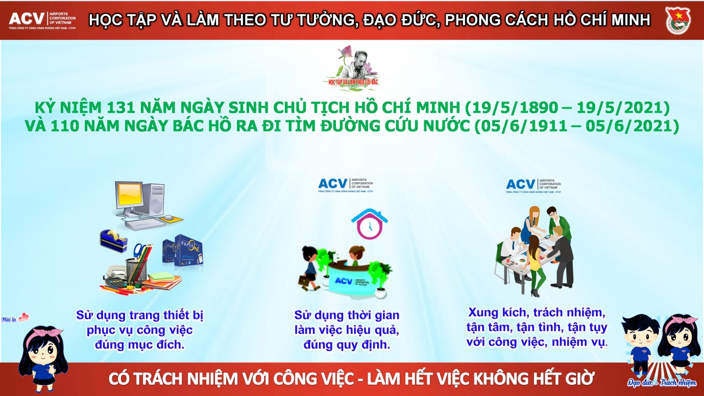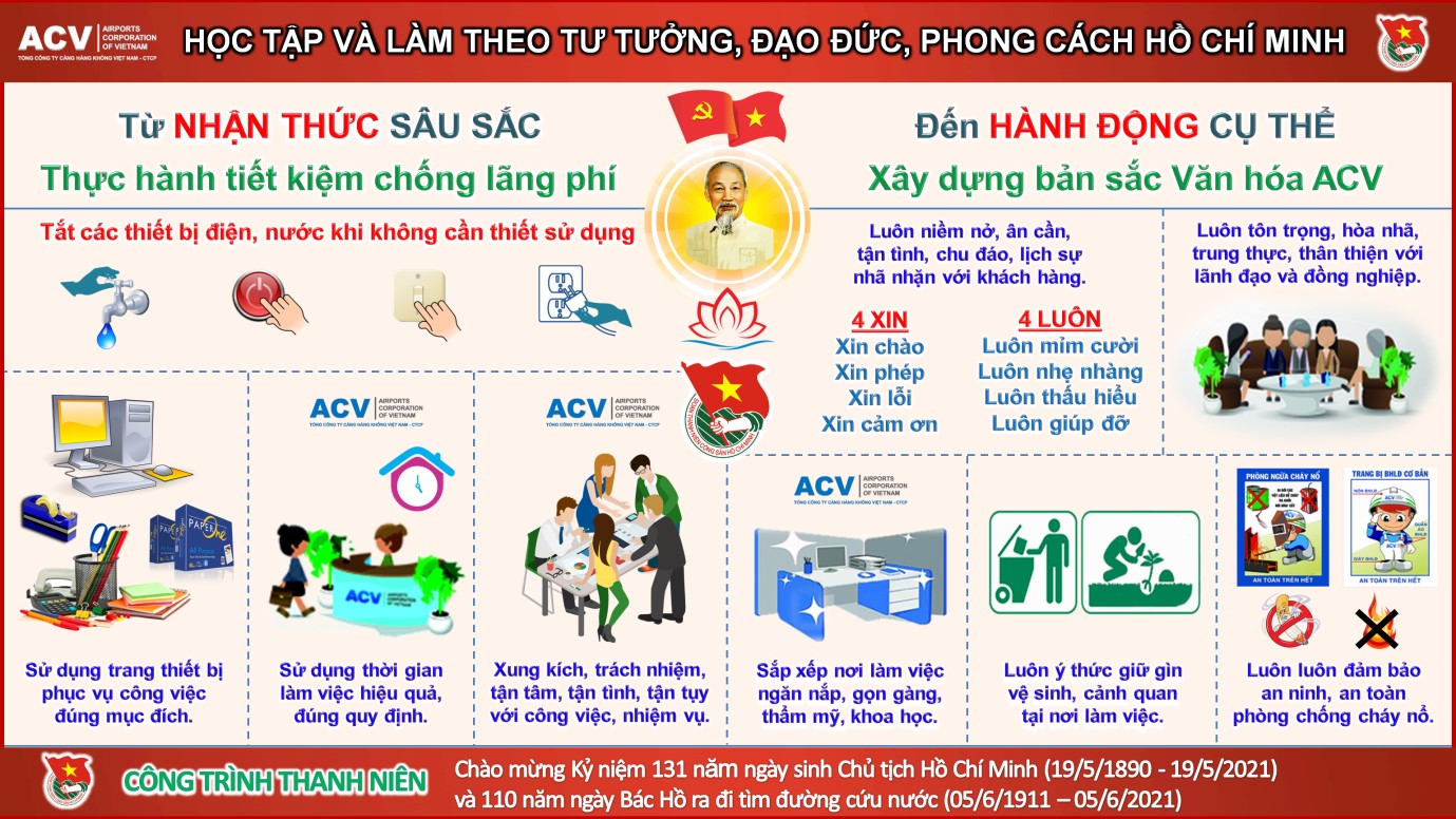 Chào mừng kỷ niệm 131 năm ngày sinh Chủ tịch Hồ Chí Minh (19/5/1890 – 19/5/2021), 110 năm ngày Bác Hồ ra đi tìm đường cứu nước (05/6/1911 – 05/6/2021), Ban Thường vụ Đoàn Thanh niên ACV đã tích cực đẩy mạnh các phòng trào tới các đoàn viên, thanh niên về việc “Học tập và làm theo tấm gương, đạo đức, phong cách Hồ Chí Minh”. Nội dung chủ đạo lần này là việc áp dụng tư tưởng của Bác về thực hành tiết kiệm, chống lãng phí.
