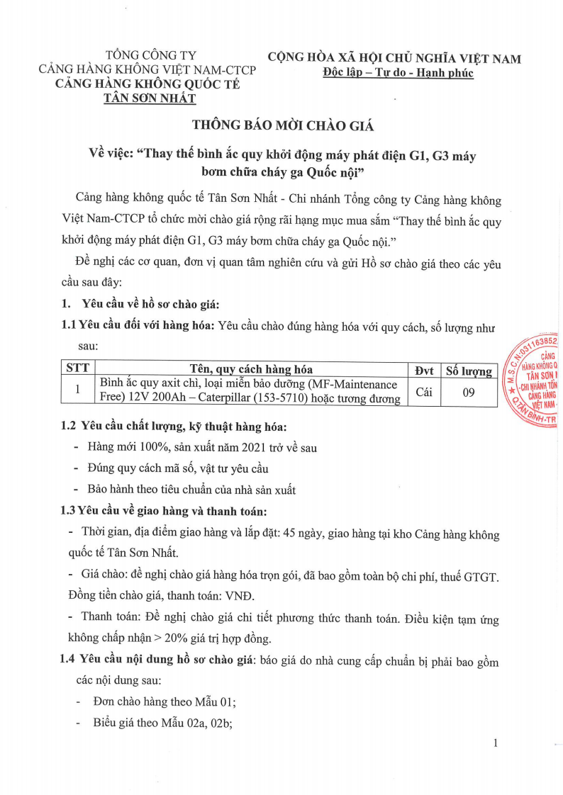 TBMCG: “Thay thế bình ắc quy khởi động máy phát điện G1, G3 máy bơm chữa cháy ga Quốc nội - Cảng HKQT Tân Sơn Nhất".