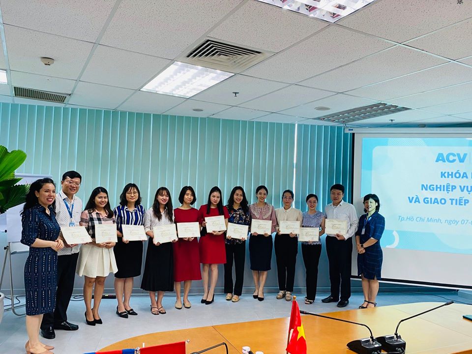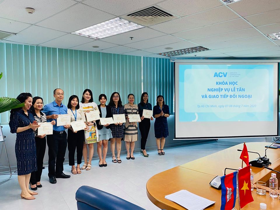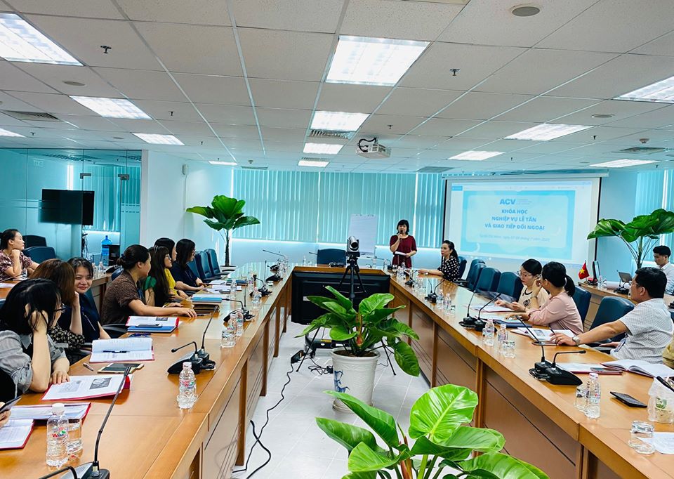 Trong 2 ngày 07 & 08/7/2020, Tổng công ty Cảng hàng không Việt Nam – CTCP (ACV) phối hợp với Trung tâm Đào tạo và Bồi dưỡng kiến thức ngoại giao thuộc Bộ Ngoại giao (CEFALT) tổ chức khóa học về nghiệp vụ lễ tân và giao tiếp đối ngoại cho 40 cán bộ nhân viên làm công tác hành chính, lễ tân, hợp tác quốc tế tại các Văn phòng, Ban chức năng thuộc Tổng công ty.