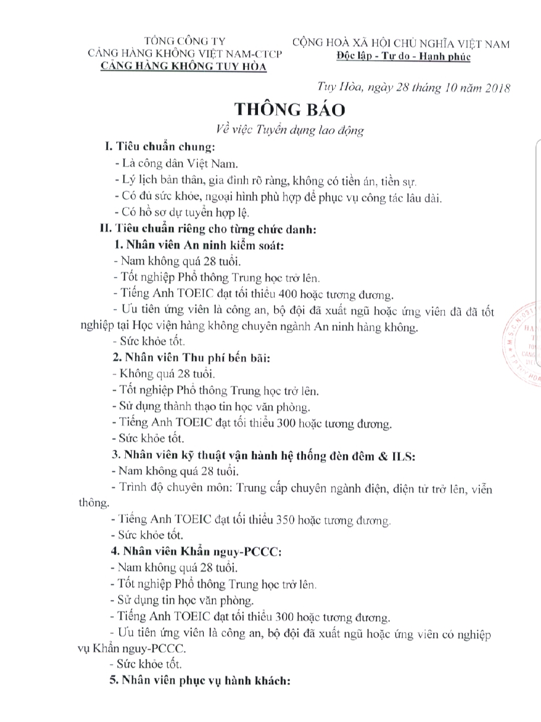 THÔNG BÁO TUYỂN DỤNG LAO ĐỘNG LÀM VIỆC TẠI CHK TUY HÒA 2024