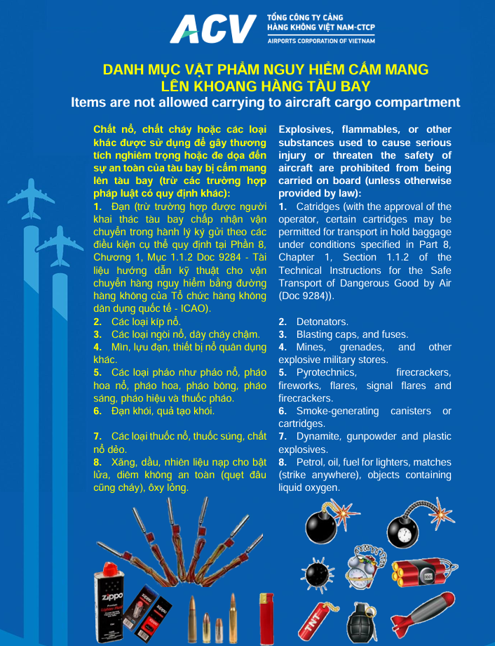 1. Danh mục vật phẩm nguy hiểm cấm mang lên khoang hàng tàu bay
