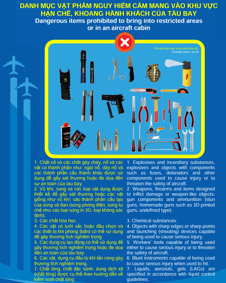 2. Danh mục vật phẩm nguy hiểm cấm mang vào khu vực hạn chế, khoang hành khách của tàu bay