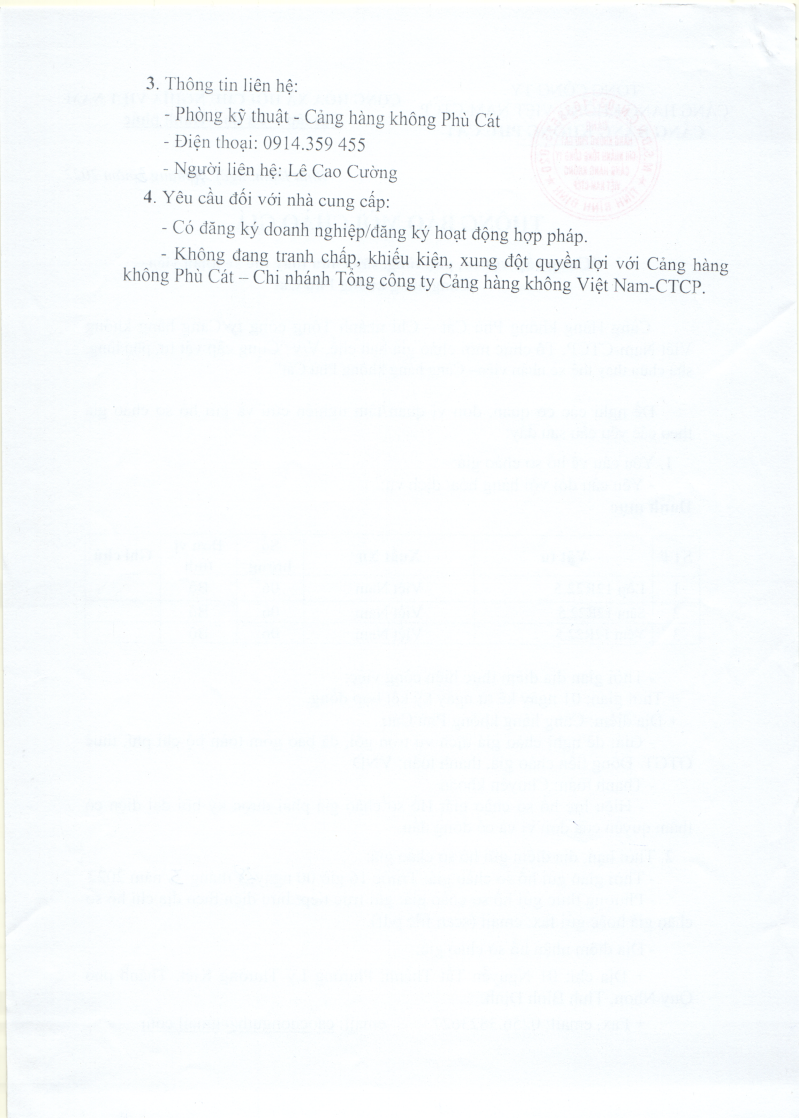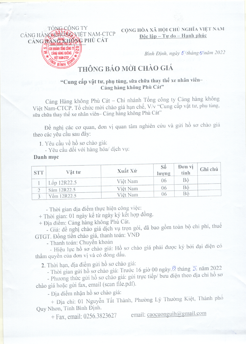 TBMCG: "Cung cấp vật tư, phụ tùng, sửa chữa thay thế xe nhân viên - Cảng hàng không Phù Cát".