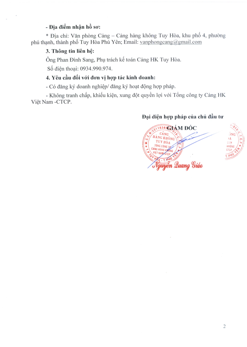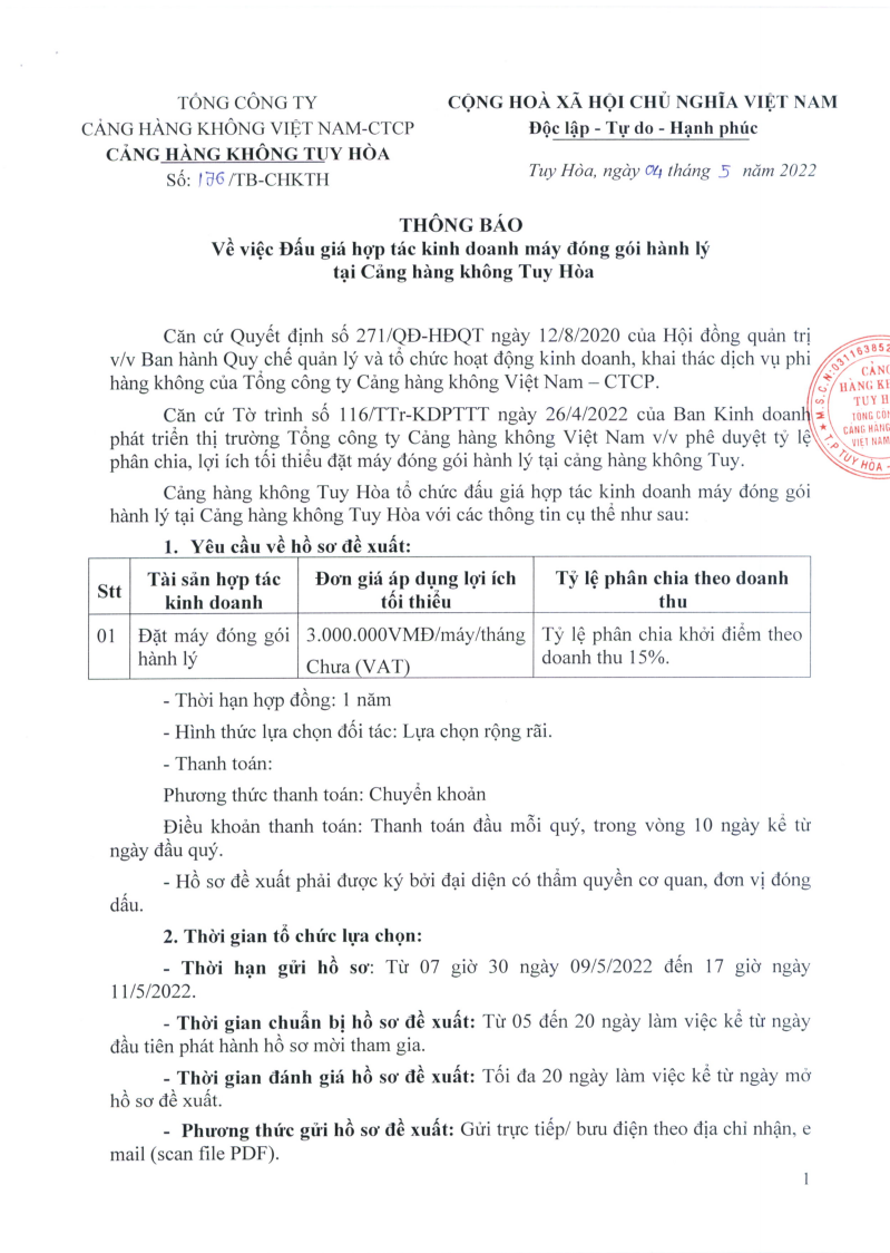 TBMCG: “Đấu giá hợp tác kinh doanh máy đóng gói hành lý tại Cảng HK Tuy Hòa".