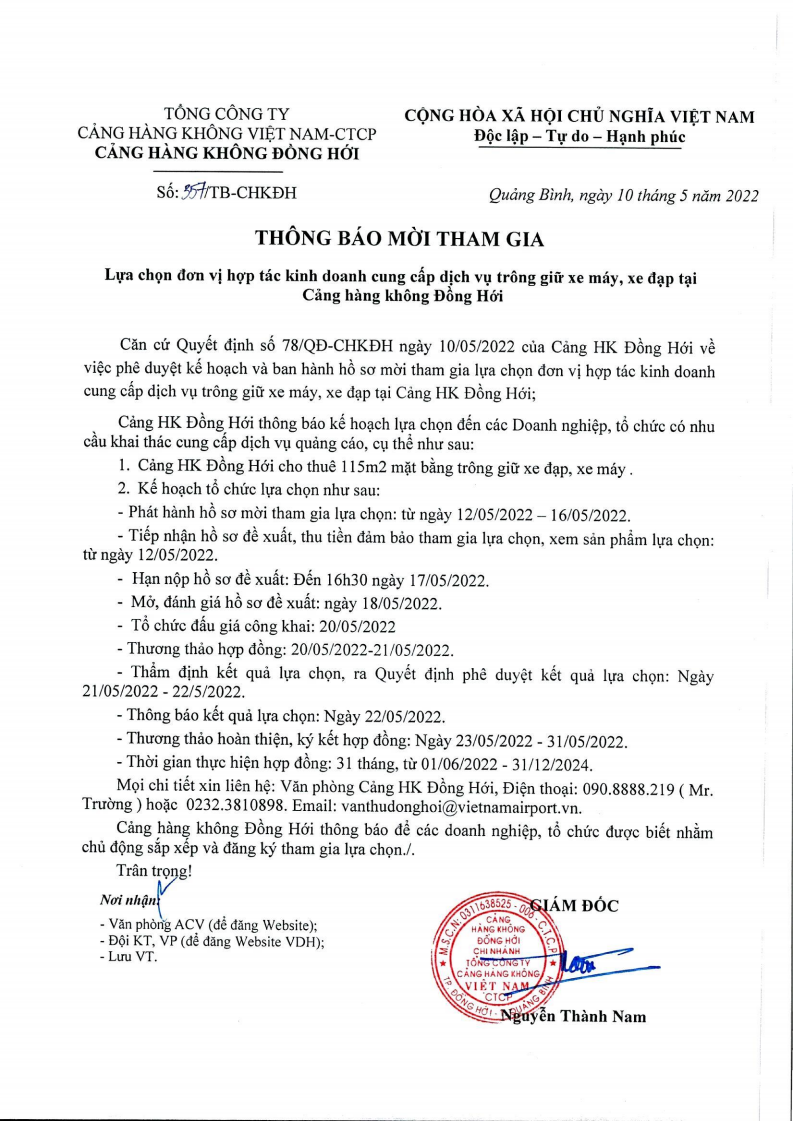 TBMCG:"Lựa chọn đơn vị hợp tác kinh doanh cung cấp dịch vụ trông giữ xe máy, xe đạp tại Cảng hàng không Đồng Hới"