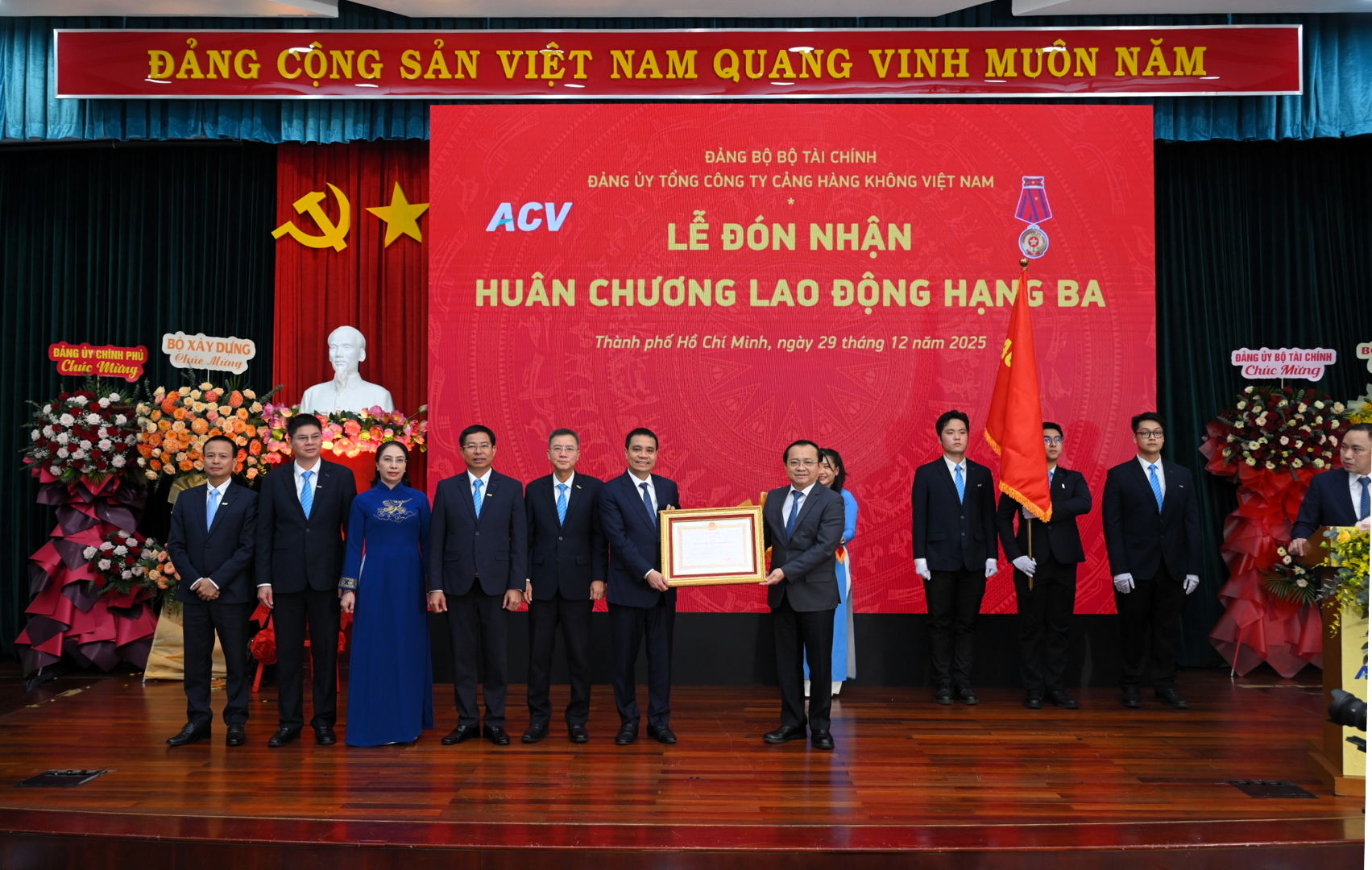 Ngày 29/12/2025, Tổng công ty Cảng hàng không Việt Nam (ACV) tổ chức hội nghị tổng kết công tác xây dựng Đảng và hoạt động sản xuất kinh doanh năm 2025, triển khai nhiệm vụ năm 2026. Tại lễ tổng kết, ACV đã vinh dự đón nhận Huân chương Lao động hạng Ba vì có thành tích xuất sắc trong công tác “ Đẩy mạnh kết cấu hạ tầng đồng bộ, hiện đại; thực hành tiết kiệm, chống lãng phí”.
