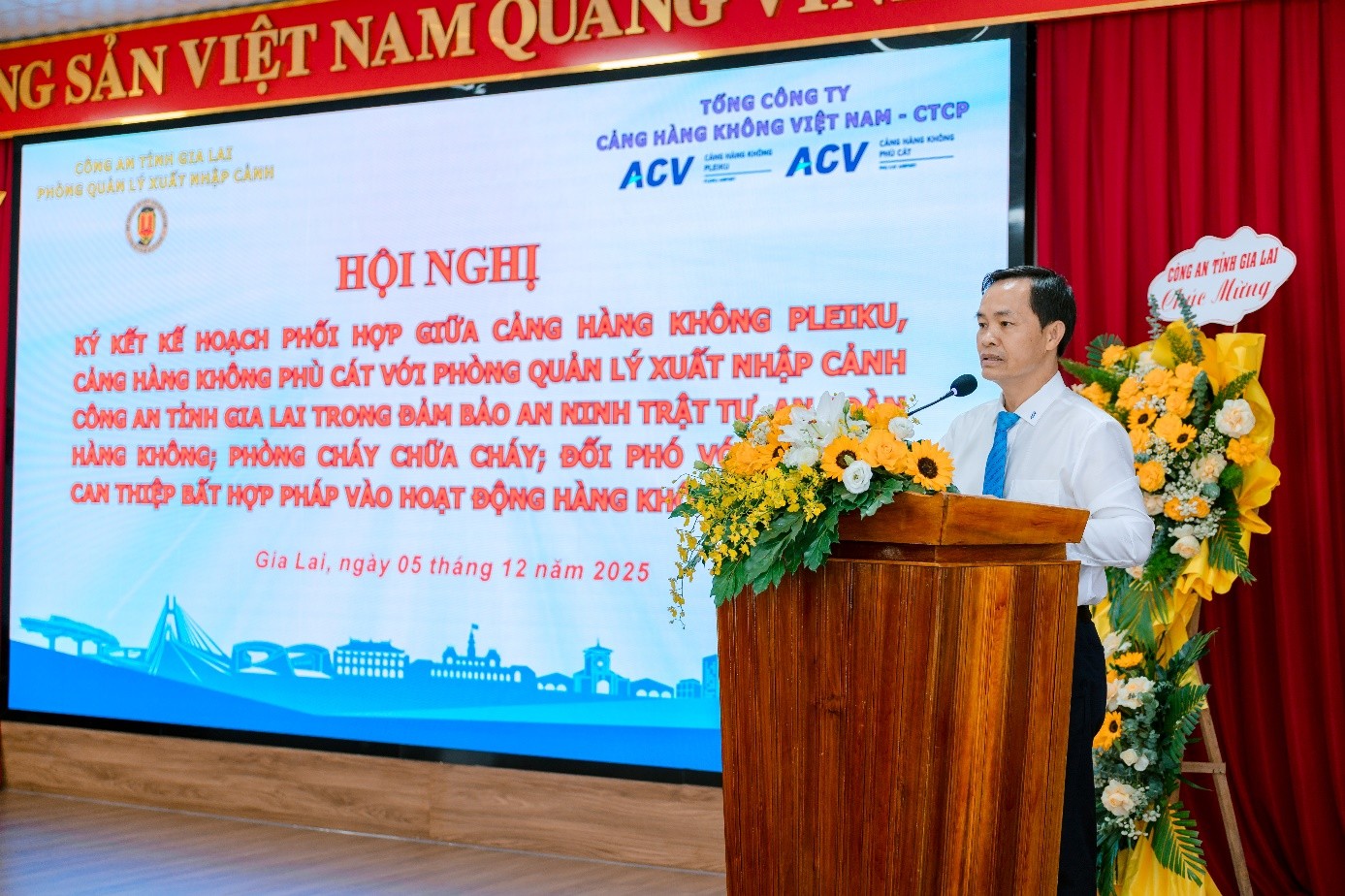Chiều ngày 05/12/2025, Cảng hàng không (CHK) Pleiku đã chủ trì Hội nghị ký kết Kế hoạch phối hợp đảm bảo an ninh, an toàn hàng không với CHK Phù Cát và Phòng Quản lý xuất nhập cảnh (PA08) – Công an tỉnh Gia Lai.