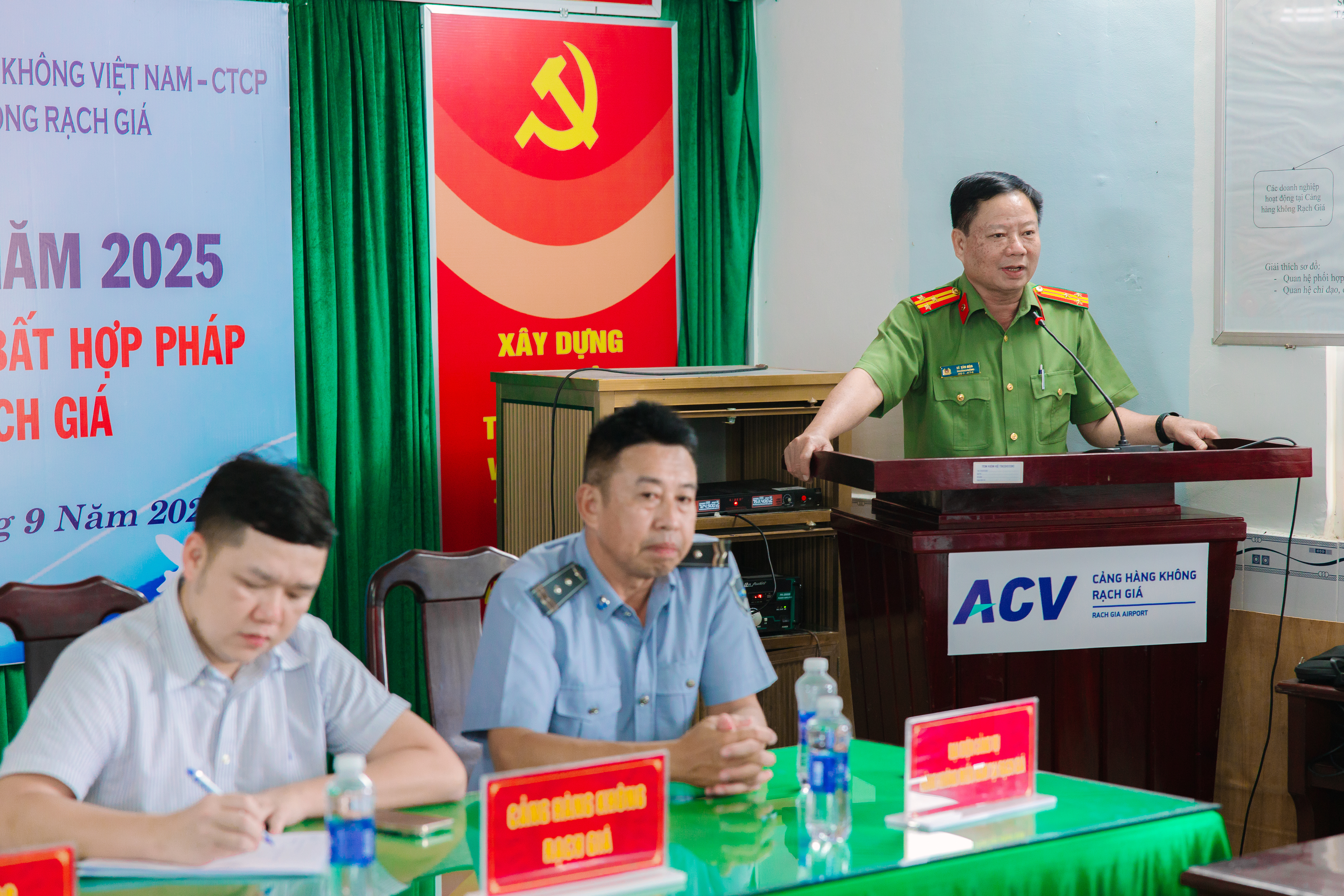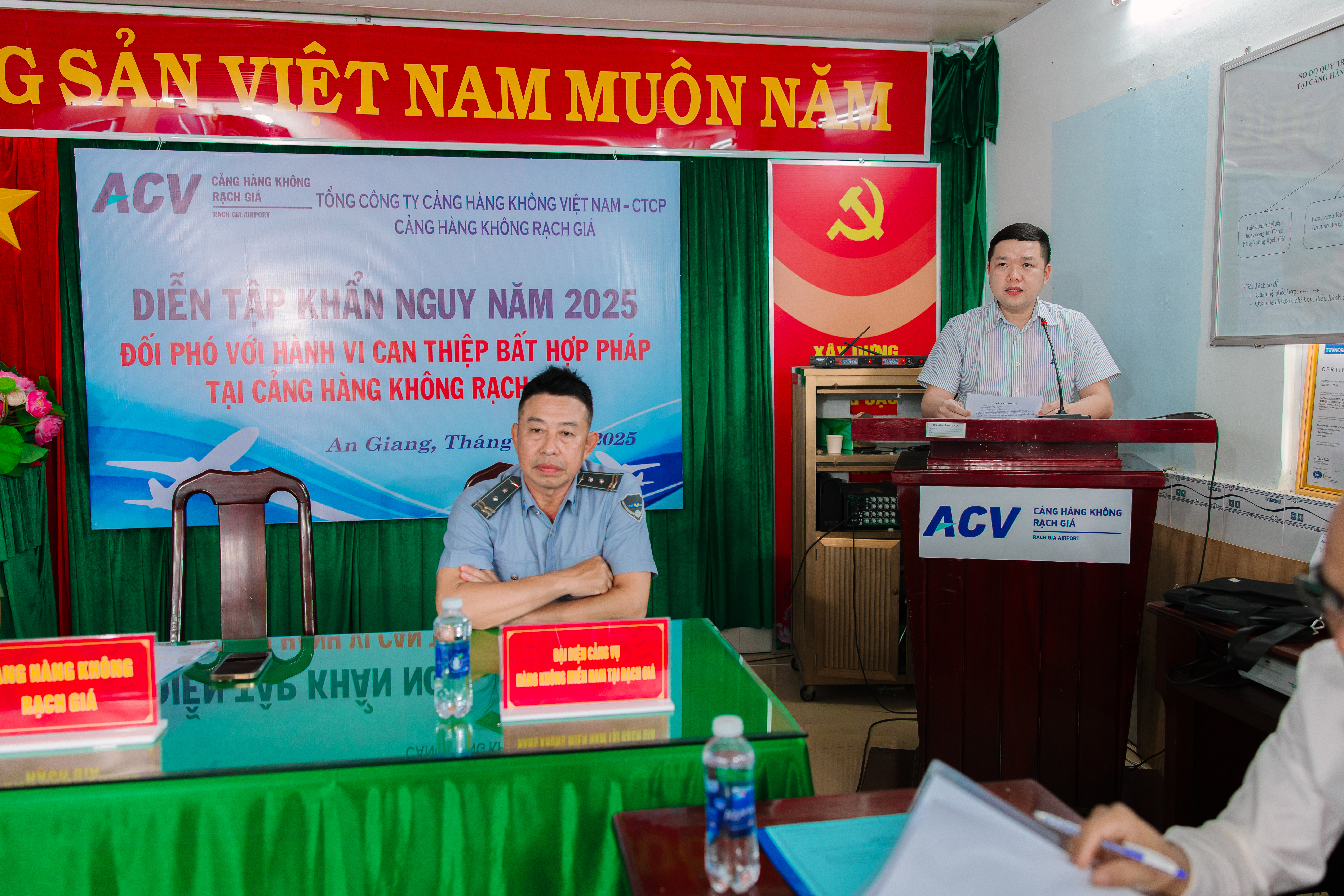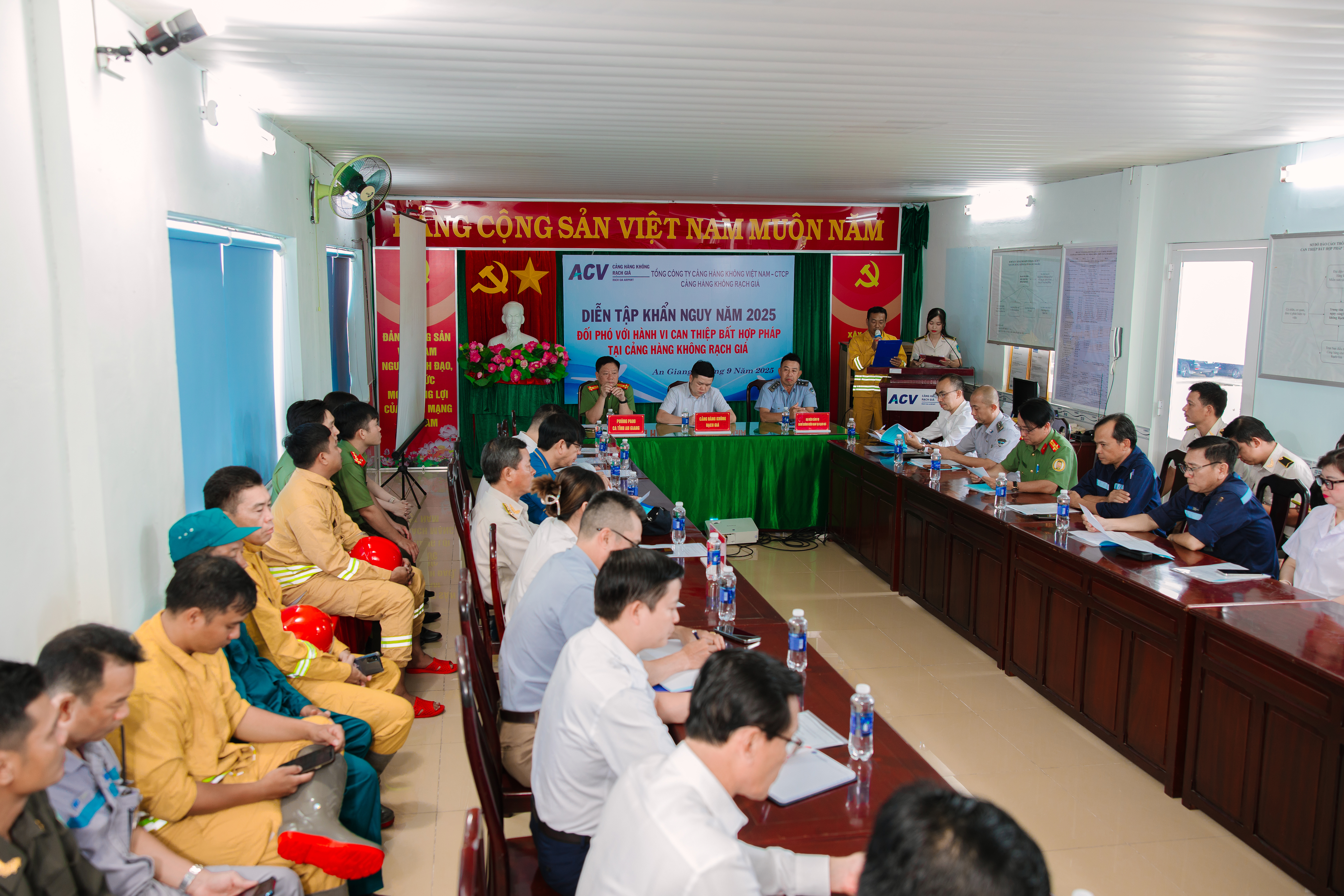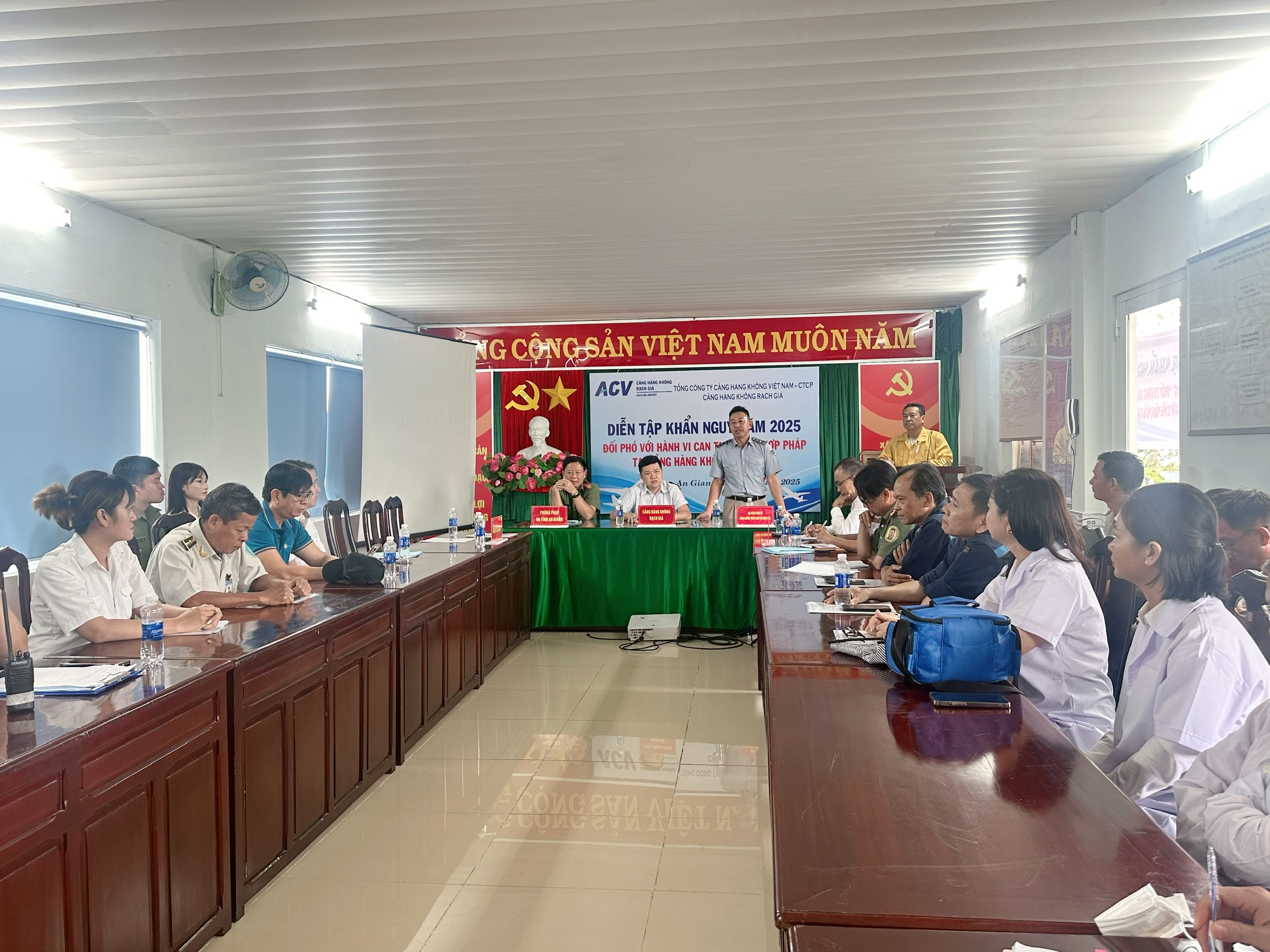 Thực hiện Kế hoạch số 39/KH-CHKRG ngày 23/9/2025 về việc tổ chức diễn tập khẩn nguy cấp cơ sở đối phó với hành vi can thiệp bất hợp pháp vào hoạt động hàng không dân dụng, ngày 07/10/2025, Cảng hàng không Rạch Giá đã phối hợp Phòng PA08 - Công an tỉnh An Giang và các cơ quan, đơn vị liên quan tổ chức diễn tập khẩn nguy cấp cơ sở năm 2025.
