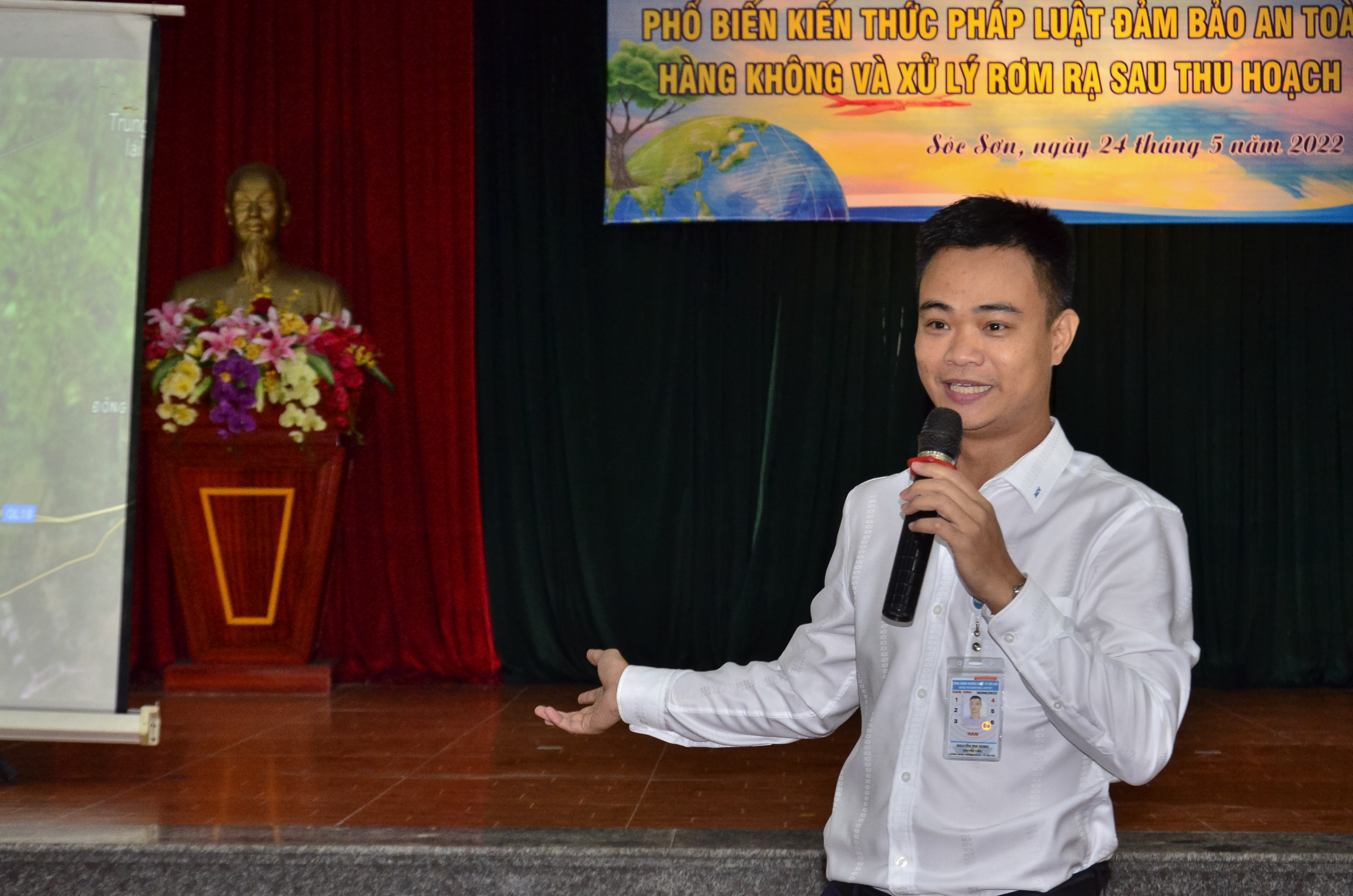 Sáng ngày 24/05/2022, tại Hội trường UBND xã Đông Xuân, huyện Sóc Sơn, Hà Nội, Cảng HKQT Nội Bài đã phối hợp với UBND xã Đông Xuân tổ chức hội nghị phổ biến kiến thức pháp luật đảm bảo ATHK và xử lý rơm rạ sau thu hoạch. Tham dự Hội nghị có đại diện Cảng vụ hàng không miền Bắc, thành viên tổ An toàn đường cất hạ cánh và Đoàn viên thanh niên Cảng HKQT Nội Bài, Công ty CP sinh thái Nông Việt, Trạm khuyến nông huyện Sóc Sơn, đại diện chính quyền và đông đảo người dân xã Đông Xuân, huyện Sóc Sơn, Hà Nội. Phát biểu khai mạc hội nghị, bà Đỗ Thị Bích Vân - Phó Chủ tịch UBND xã Đông Xuân nhấn mạnh tầm quan trọng của việc tập huấn cho bà con nông dân trong việc nhận thức tác hại của việc đốt rơm rạ đối với hoạt động bay, đồng thời cho biết xã Đông Xuân đã xây dựng và triển khai tới người dân trên địa bàn về kế hoạch xử lý rơm rạ thành phân hữu cơ.