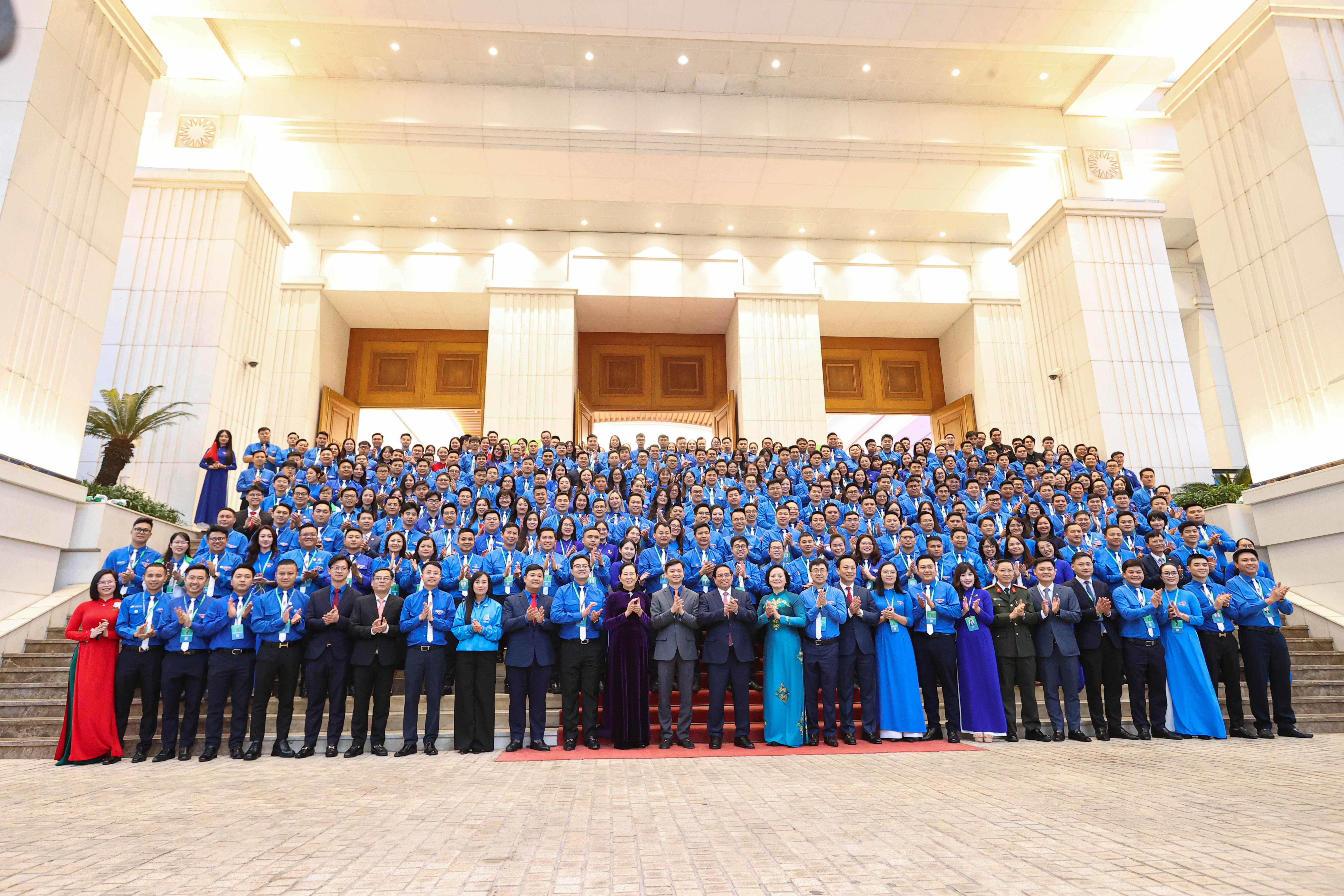 Các đại biểu thanh niên chụp ảnh lưu niệm tại trụ sở Chính phủ cùng các đồng chí lãnh đạo Đảng, Nhà nước
